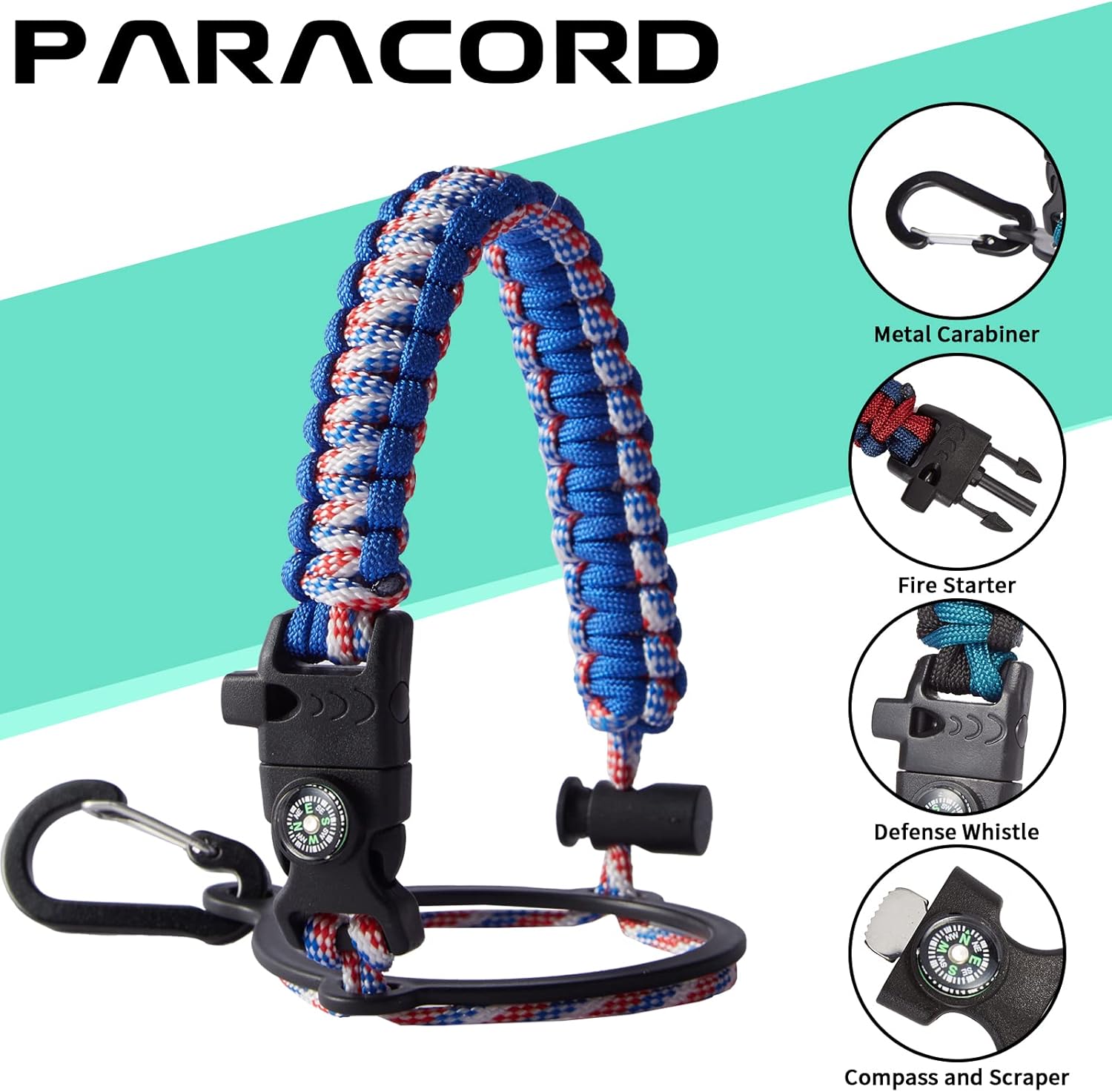 - UNIQUE DESIGNS PARACORD HANDLE: Full-function paracord handle made in individual styles to match the color of the flask water bottles. With compass, safety ring, carabiner, flint fire starter & whistle. It unravels into a sturdy and taut rope in an emergency, making the large water jug an ideal survival kit for expeditions in the wild
