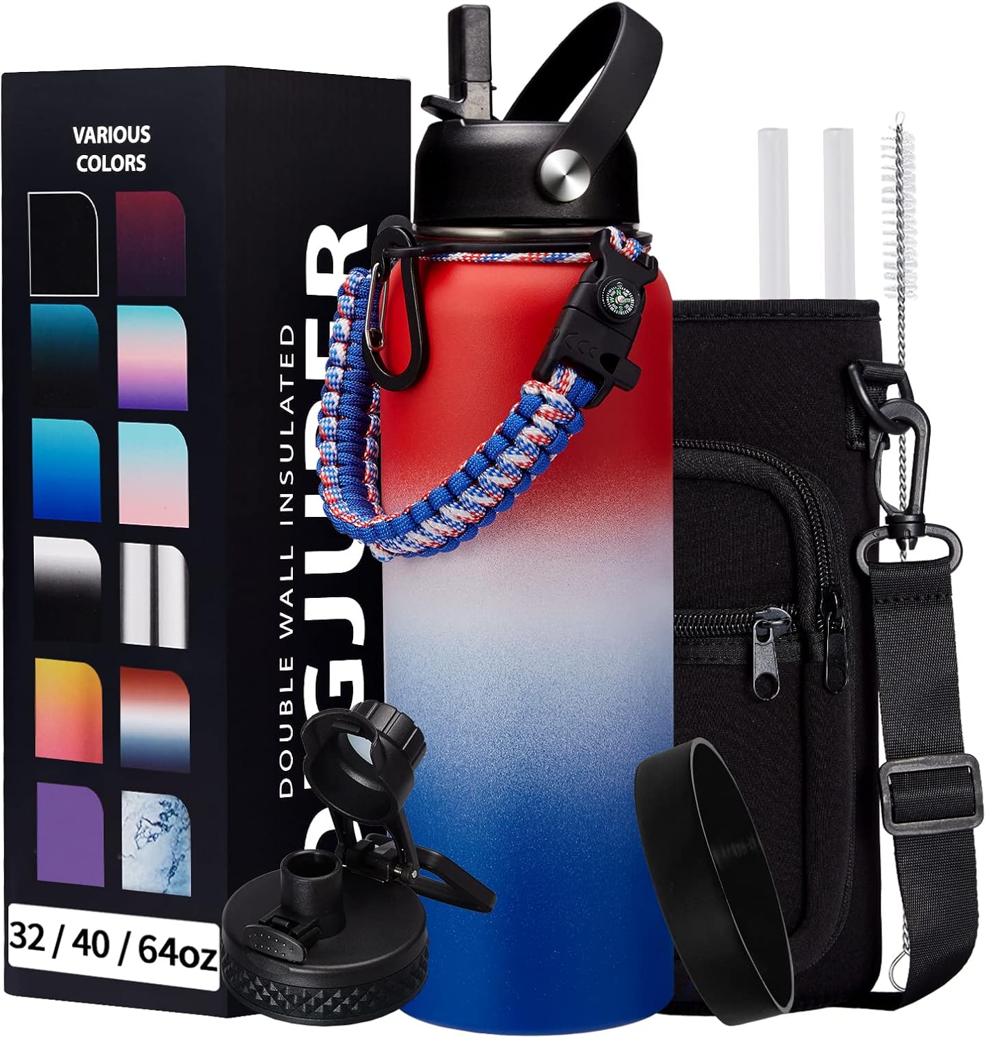 - COMBO—Super Deal: Buy 40oz stainless steel water bottles and get 9 accessories (2 x lids, 1 x survival paracord, 1 x carrying pouch, 1 x shoulder strap, 1 x protective cup mat, 2 x straws, 1 x straw brush). WITH A LIFETIME GUARANTEE, these thermal water bottles are the perfect gift for use at home, work, school, road trips, hiking, sporting events, or just hanging out