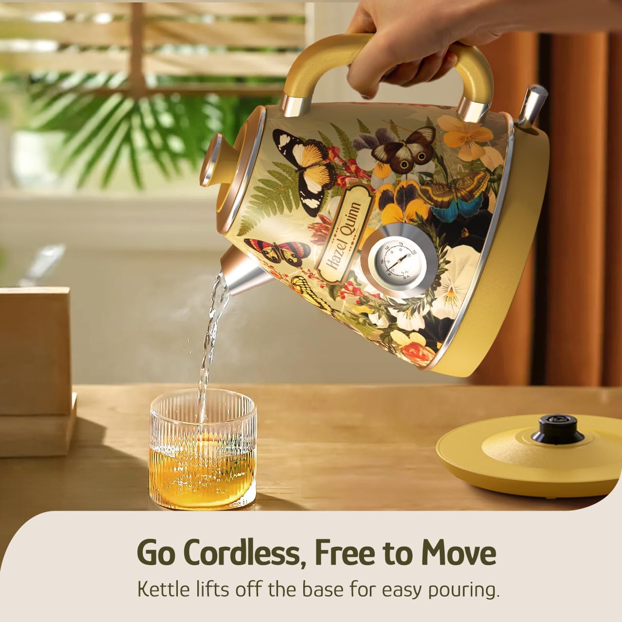 Hazel Quinn X Eduardo Recife Electric Kettle - 1200W Fast Water Boiling, 1.7L/57oz, All 304 Stainless Steel Interior, BPA-Free, Auto Shut-Off, Cordless Retro Teapot with Thermometer - Floral Patterned