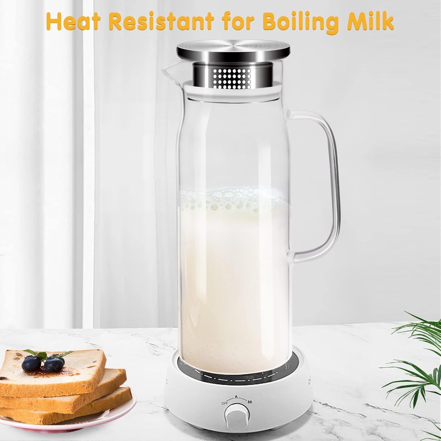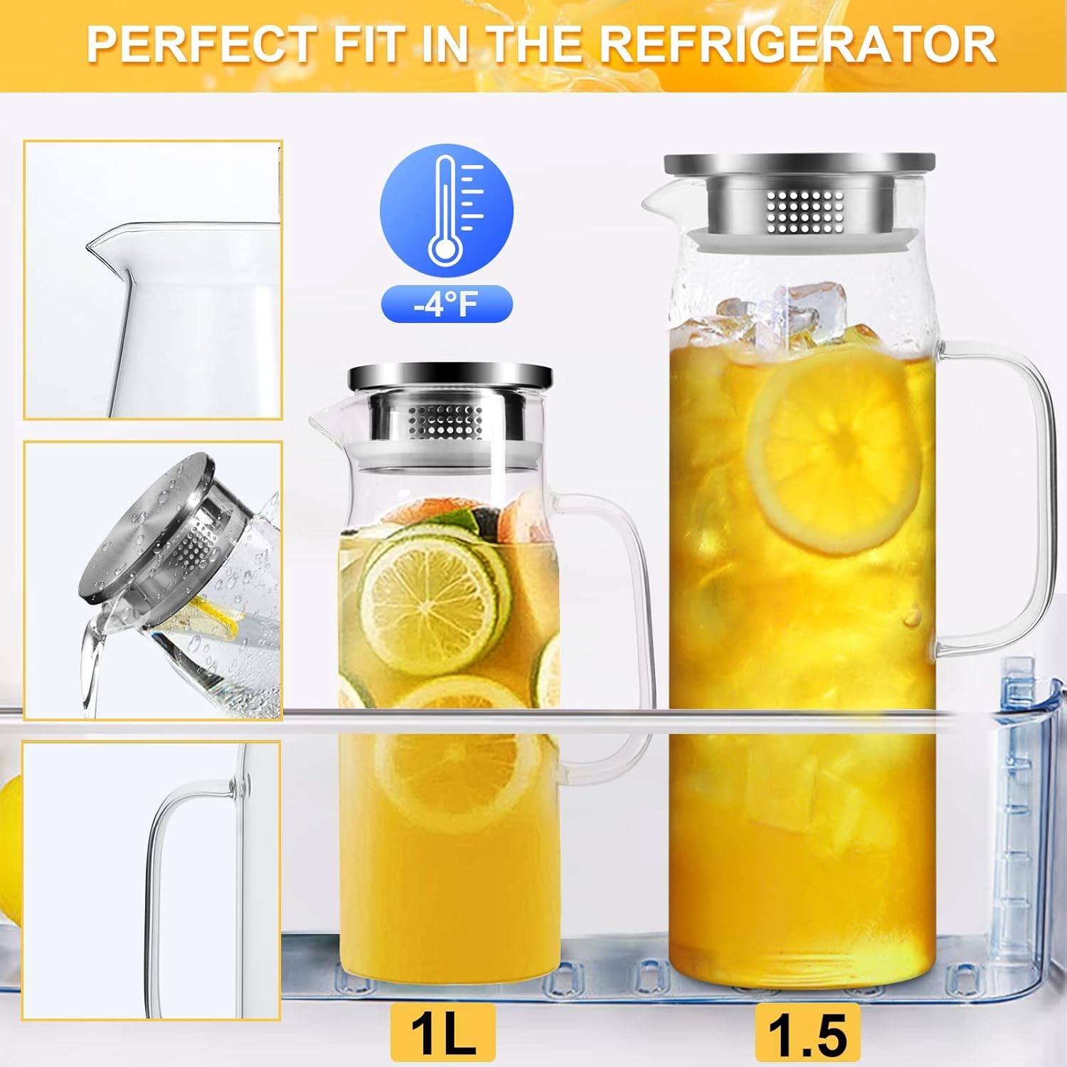 - PREMIUM QUALITY BOROSILICATE GLASS JUG: Glass jugs are thicker than ordinary glass jugs. Made of high-quality borosilicate glass. lead-free, lightweight, and durable, Our water glass jug can withstand temperatures from -4 ° F to 302 °F. Thick glass has strong impact resistance and resistance to high and low temperatures, so you can pour boiling water into this drink pitcher safely
