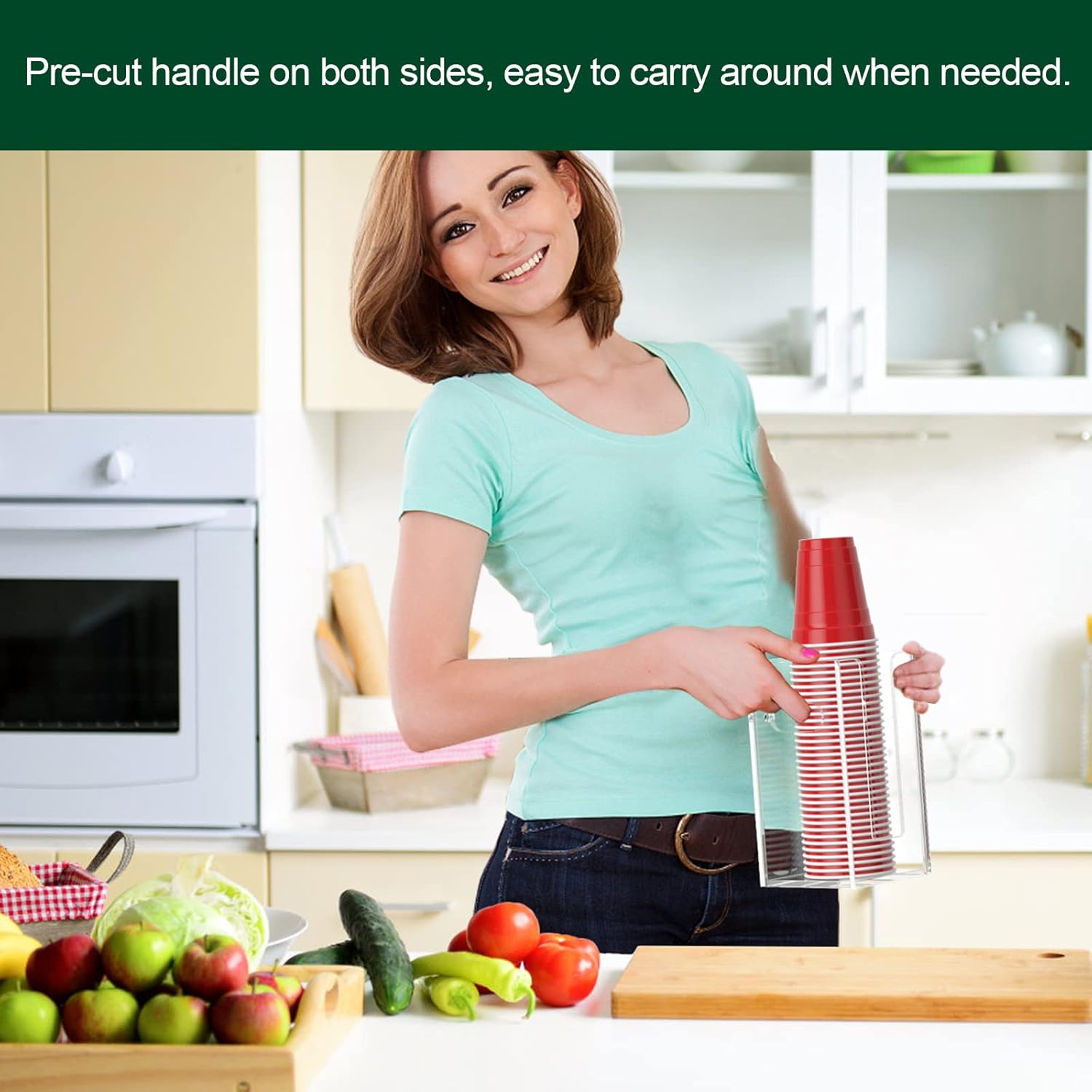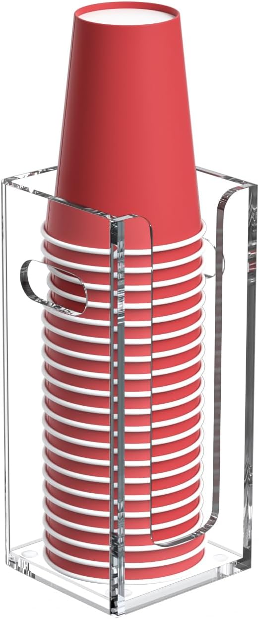 - Material - made of 4mm thickness acrylic, the disposable cup organizer is an ideal container to make your home kitchen bathroom or break room office coffee station area less cluttered, it keeps plastic or paper coffee cups or tops organized. No more cups and lids floating around when wind picks up.