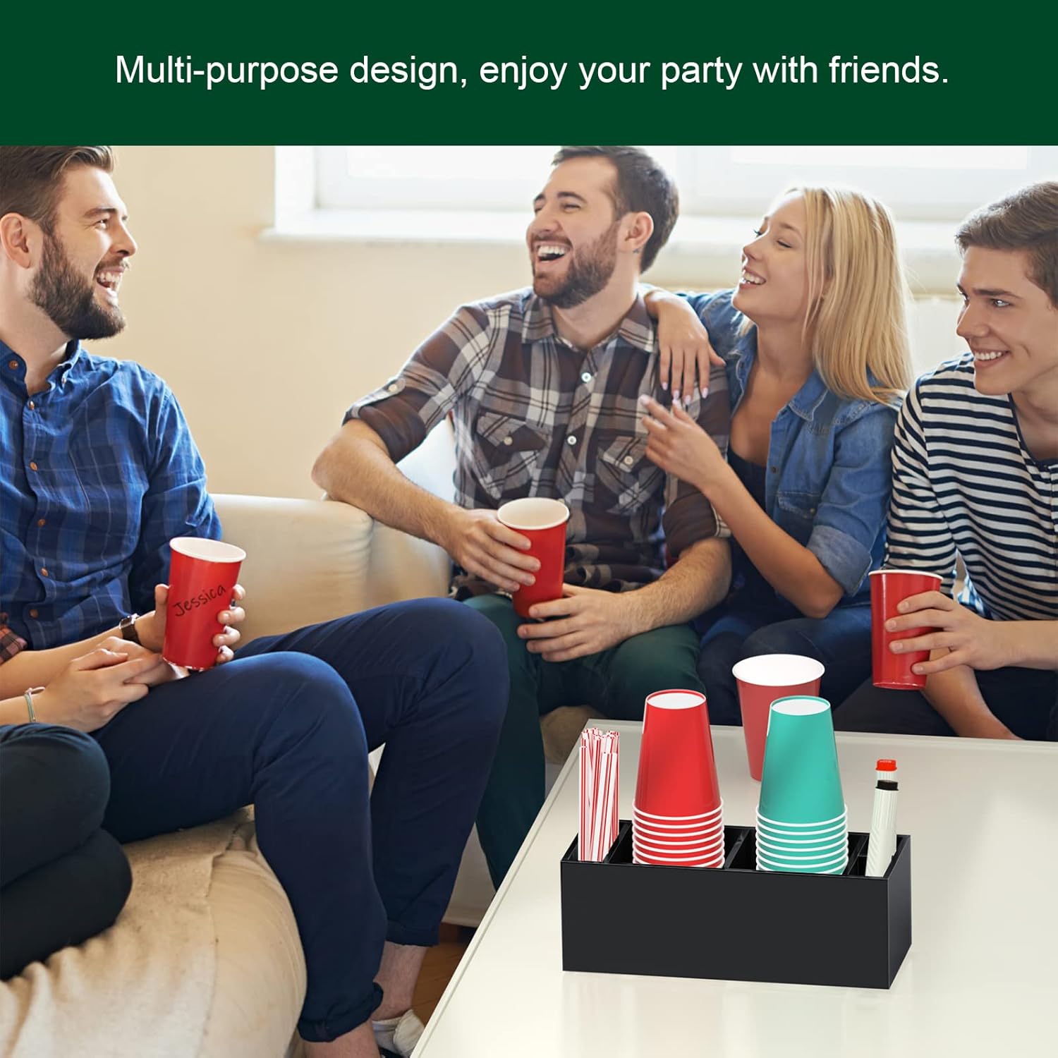 - Cup Holder with Marker Slots on Both Sides - more convenient, practical to help your family or friends save time mark their red cups and track it for refill, less waste in the gatherings, save household money! With the sided slots, you will have extra space to keep some straws, stirs, sugar packets in it when you are having a summer party, outdoor barbecue on the patio, camping trip at the lake. Can be used as a bar caddy too. Cute plastic cup holders for counter help you get rid of clutter.