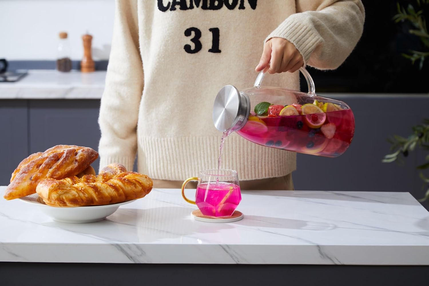 - [Perfect Size]: With 80 oz capacity, this glass pitcher big enough to serve your family daily use or entertain your guests.