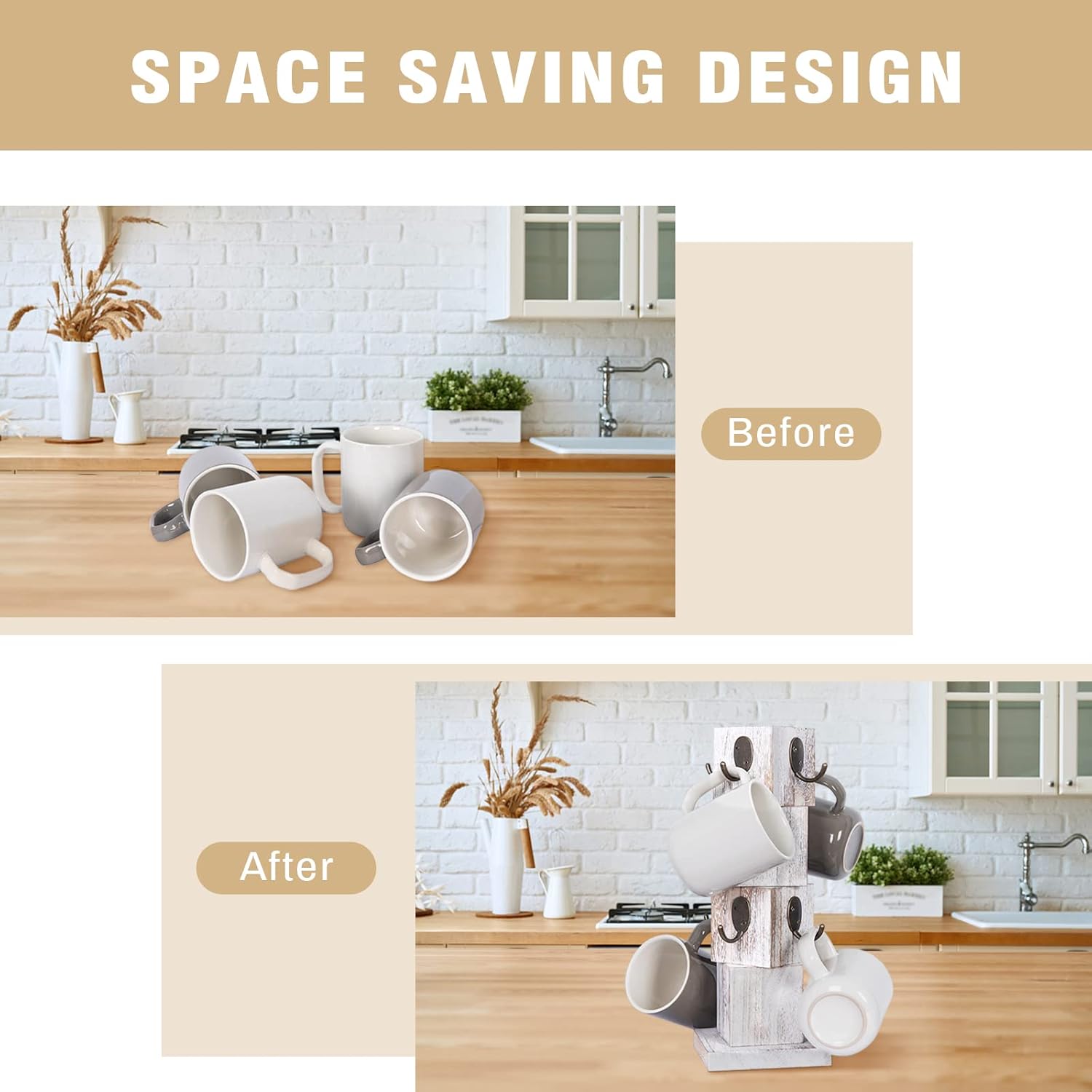 - 【Excellent Space Saving】The stand mug holder has a weighted base, which can ensure that up to 8 coffee cups or mugs are safely stored and easily accessible. The mug holders are arranged to save space on the counter, coffee bar or cabinet.