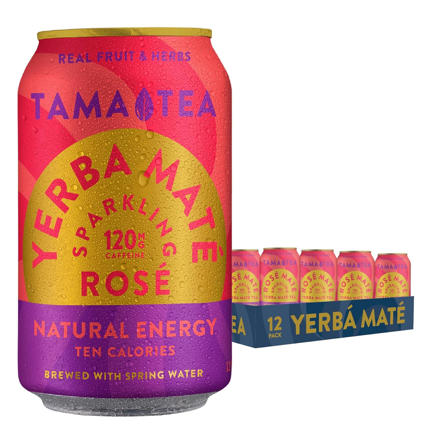 Sparkling Rose Yerba Mate by Tama Tea - Unsweetened Natural Energy Drink with Real Fruit & Herbs - Healthy Caffeine Drink Alternative - 120mg of Brain-Boosting Caffeine, 10 Calories - 12oz Pack of 12