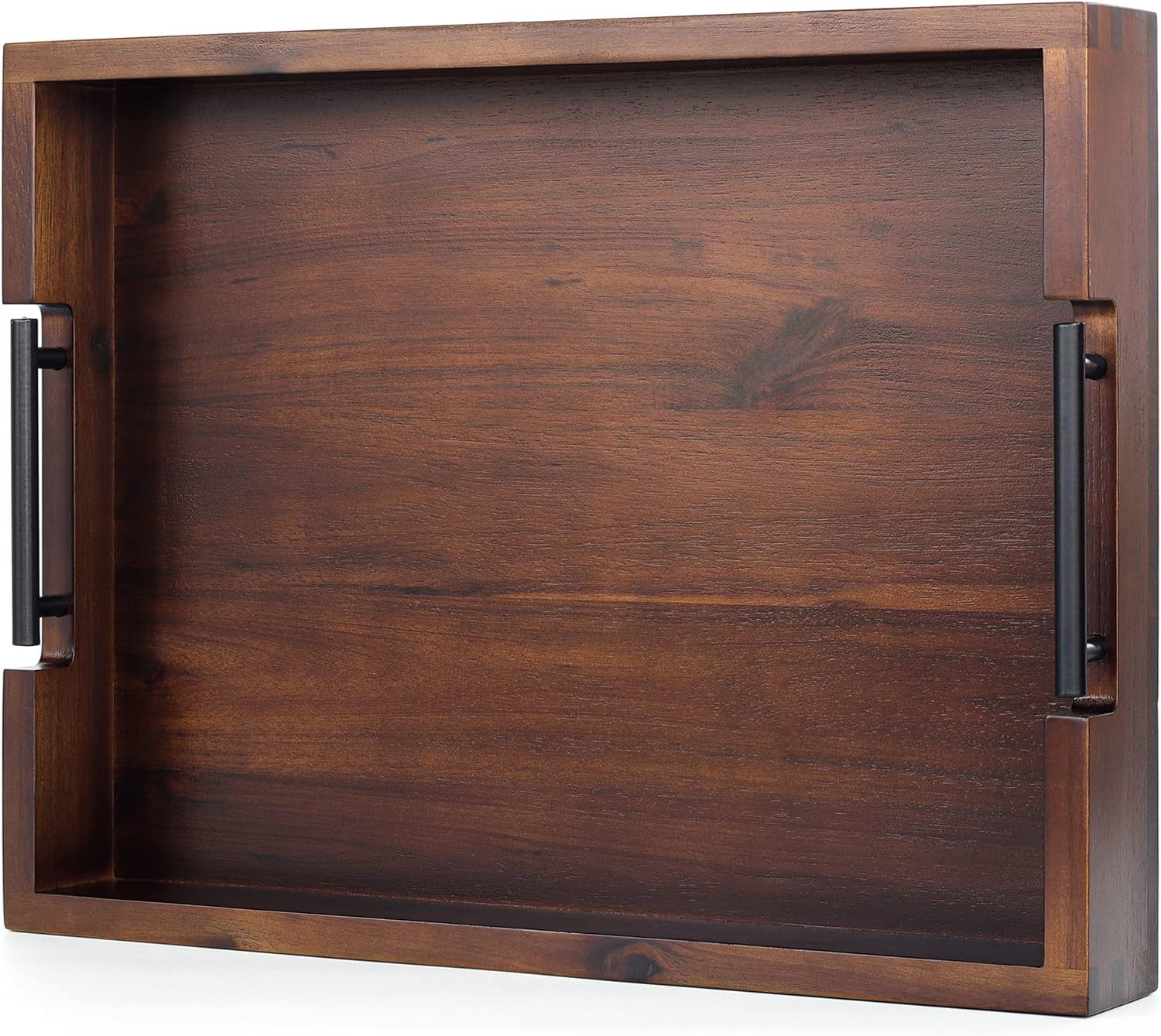 Ottoman Tray, Acacia Wood Serving Tray with Metal Handles, 16.5x12.5in Food Drinks Tray for Coffee Table, Breakfast, Dinner & Bar, Rustic Decorative Storage Tray for Ottoman, Kitchen, Packaging