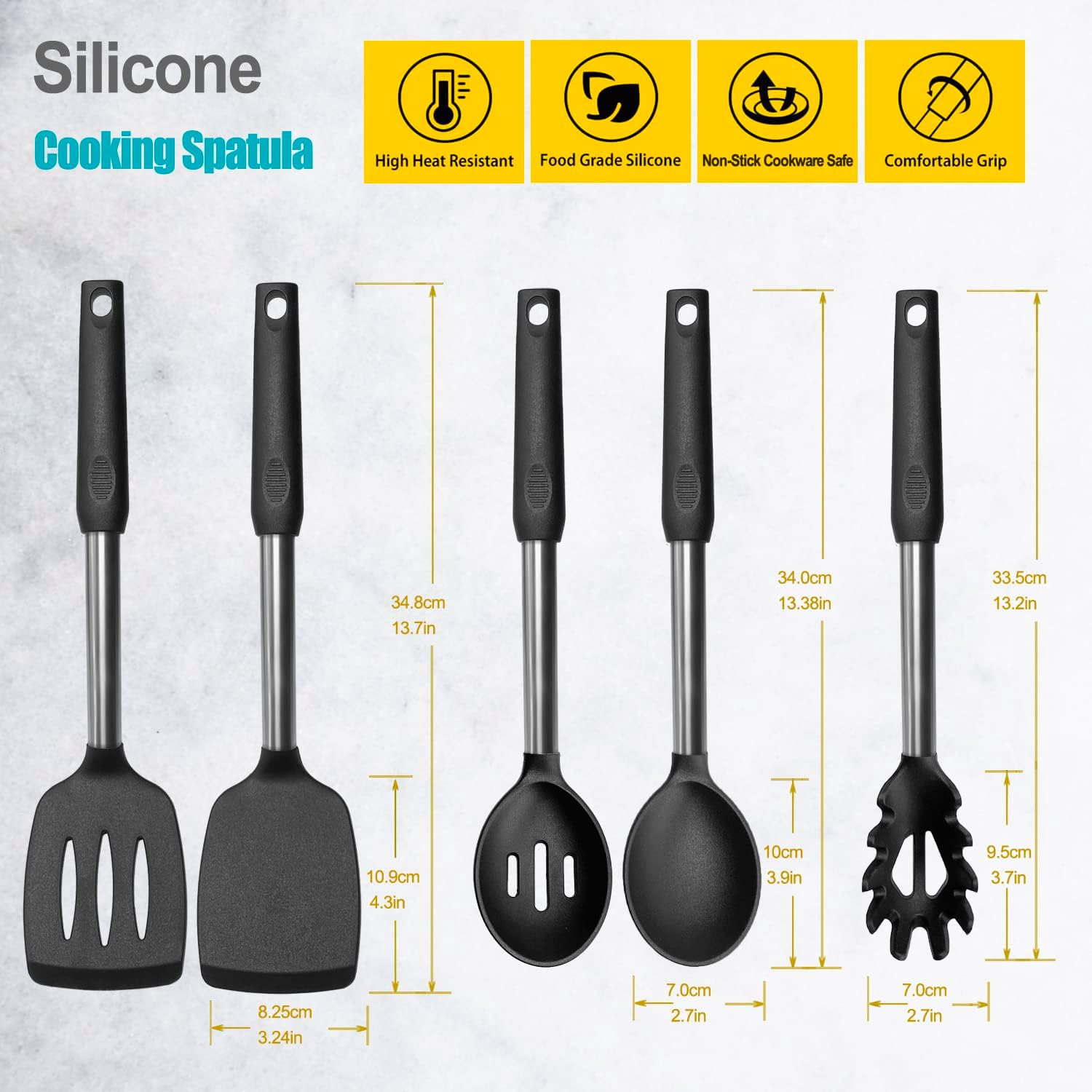 Silicone Spatula and Cooking Spoon,5 Pack Non-Stick Cooking Utensils for Kitchen,Heat Resistant Solid & Slotted Spoons and Spatulas, Stainless Steel Handle Coated with Silicone,Black