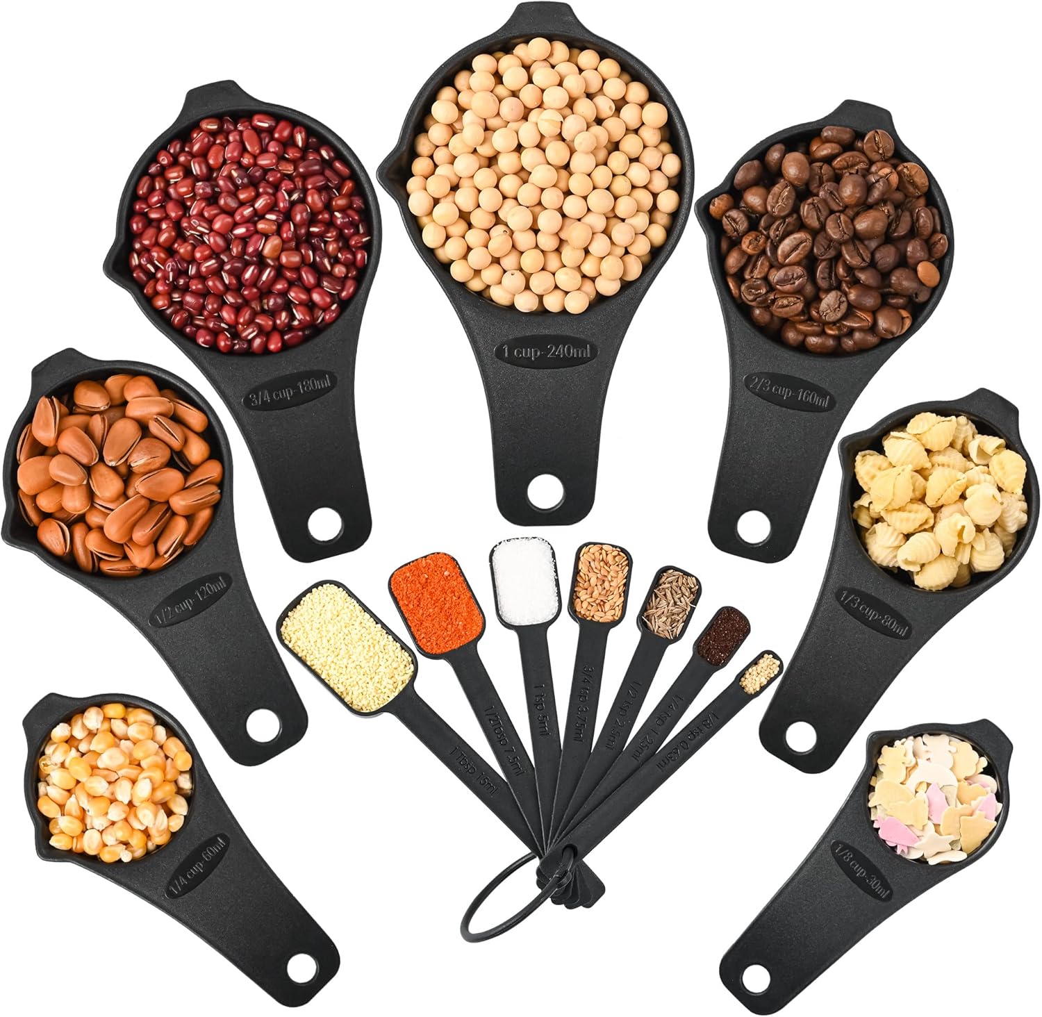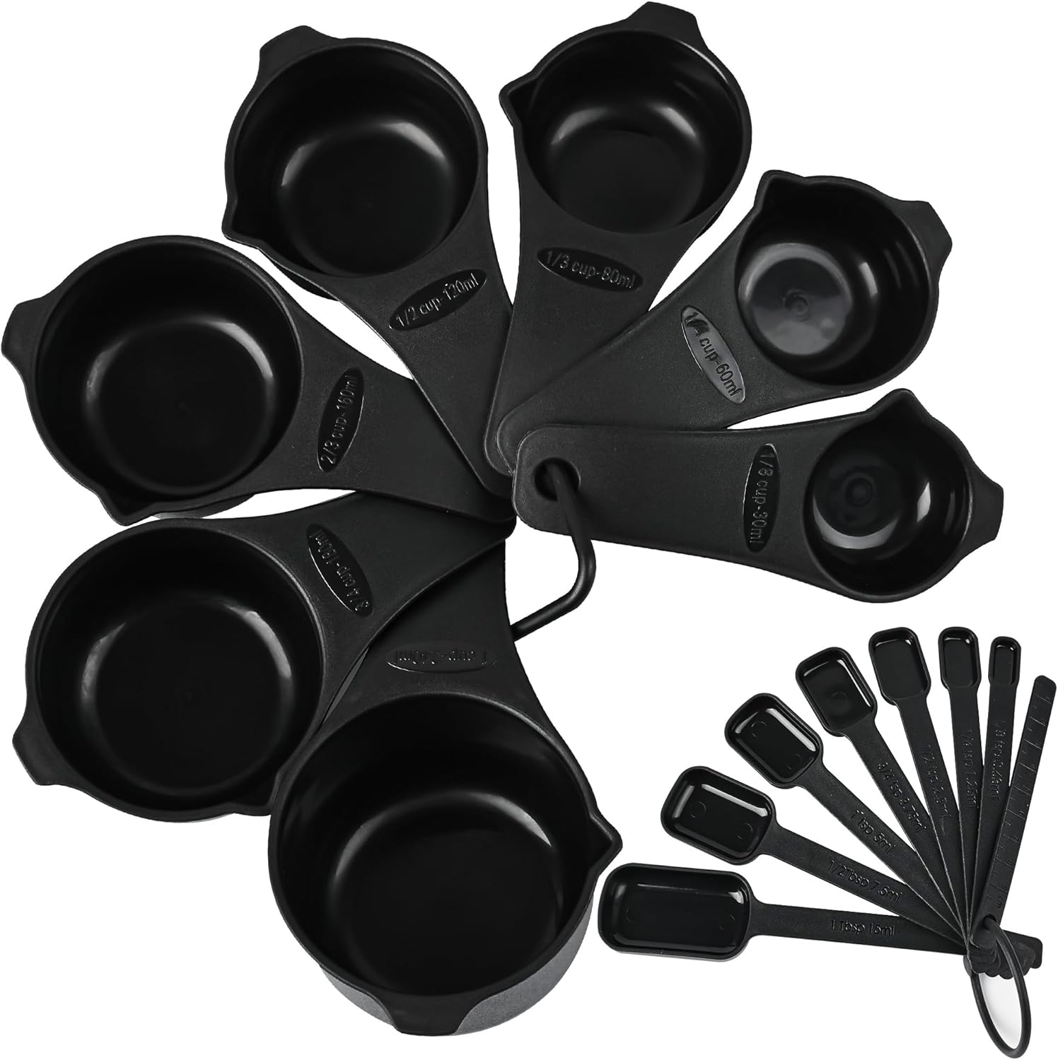 - ▲▲Measuring cups and spoons set 15: 7 black plastic measuring cups: 1/8cup-30ml;1/4cup-60ml;1/3cup-80ml; 1/2cup-120ml; 2/3cup-160ml; 3/4cup-180ml; 1cup-240ml; 7 black plastic measuring spoons:1/8tsp-0.63ml;1/4tsp-1.25ml;1/2 tsp-2.5ml;3/4 tsp-3.75ml;1tsp-5ml;1/2tbsp-7.5ml; 1tbsp-15ml; 1 X Leveler.