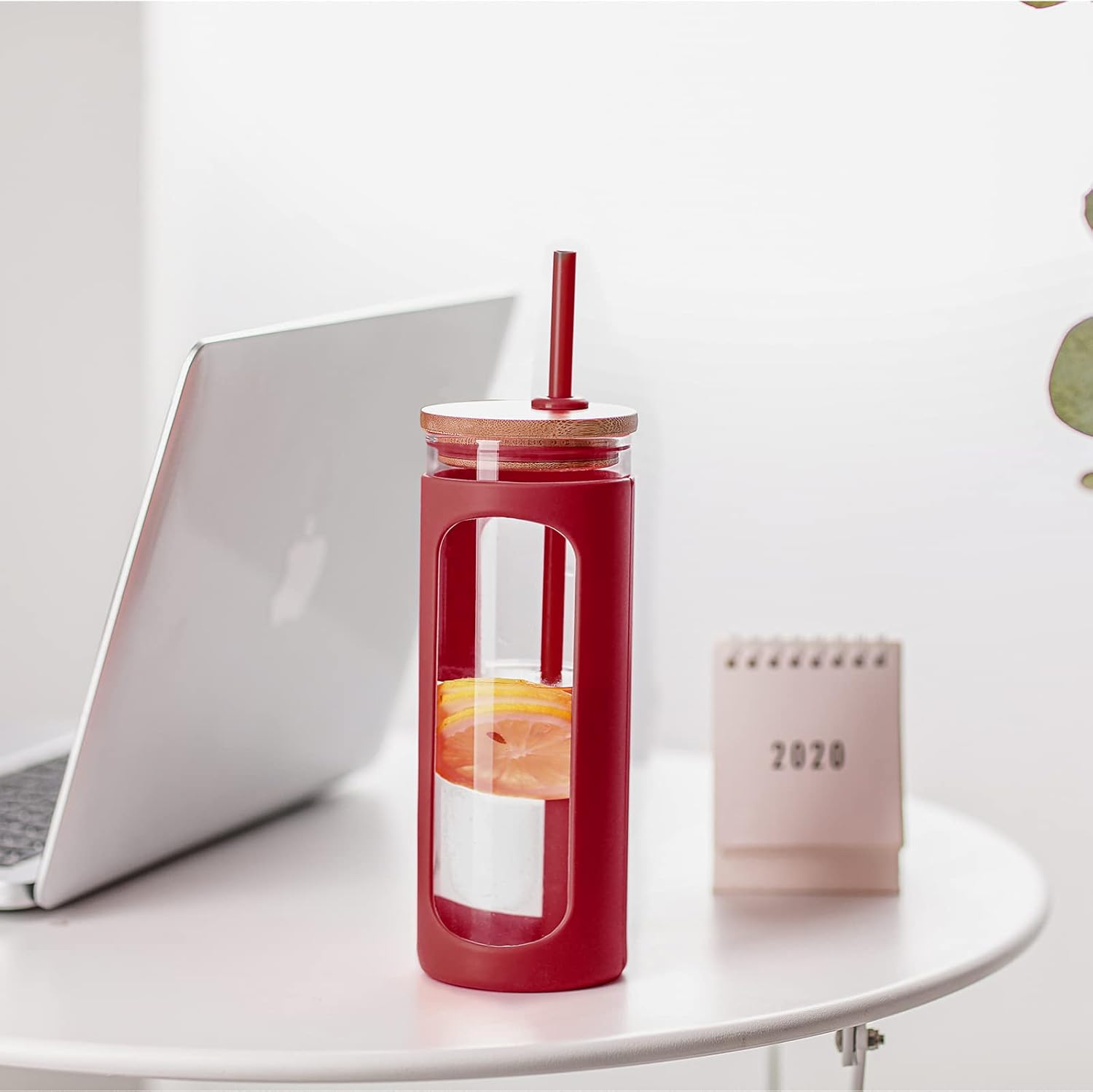 Kodrine 20oz Glass Tumbler with Straw and Lid, Iced Coffee Cups with Bamboo Lids, Glass Cups for Cold Drinks, Smoothie Cup with Silicone Sleeve for Travel, Work, BPA FREE-Barbados Cherry