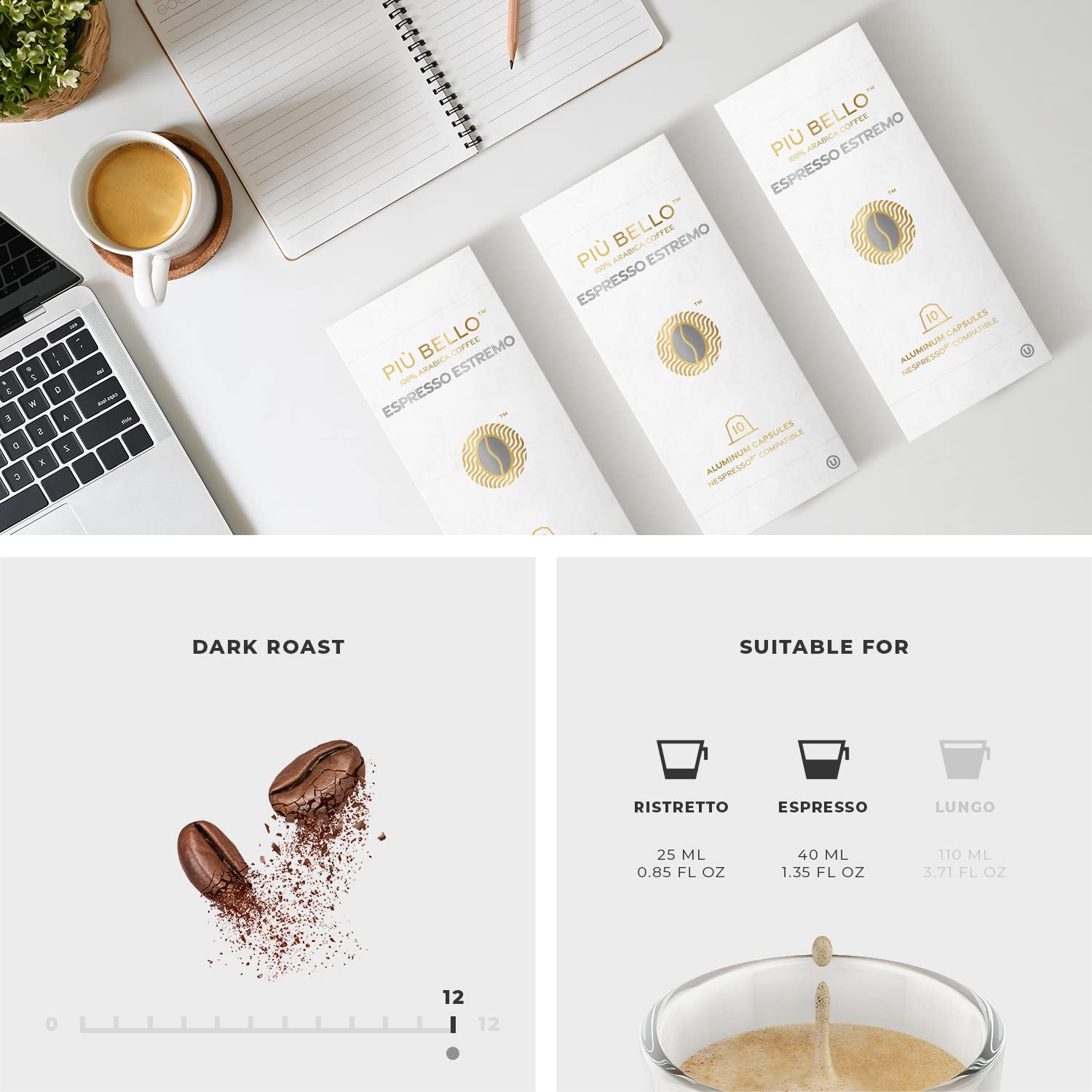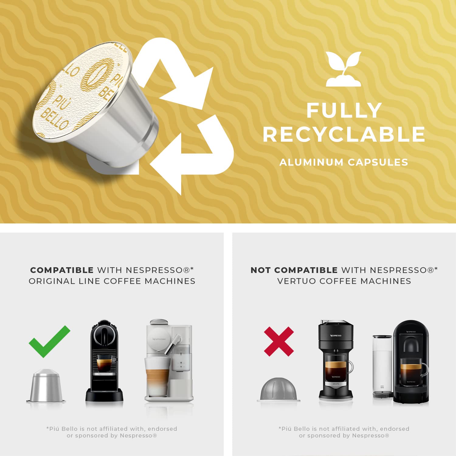- NESPRESSO COMPATIBLE PODS - Enjoy delicious cafe quality roasted coffee, brewed fast and poured steaming hot & fresh directly into your awaiting cup. Piu Bello Nespresso capsules are compatible with Nespresso Original line espresso machine.