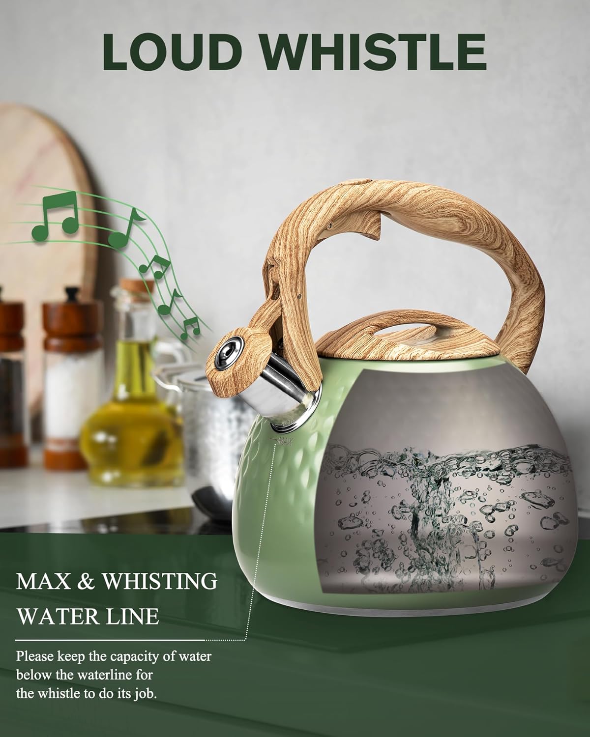 - Loud Whistle Grab Your Attention Easily : Loud & automatic whistling catch your attention even in a noisy environment. When you focus on your housework, movies, music, or any other things, the tea pot will remind you with a whistle after boiling water. To prevent you from forgetting to turn it off and drying the water up