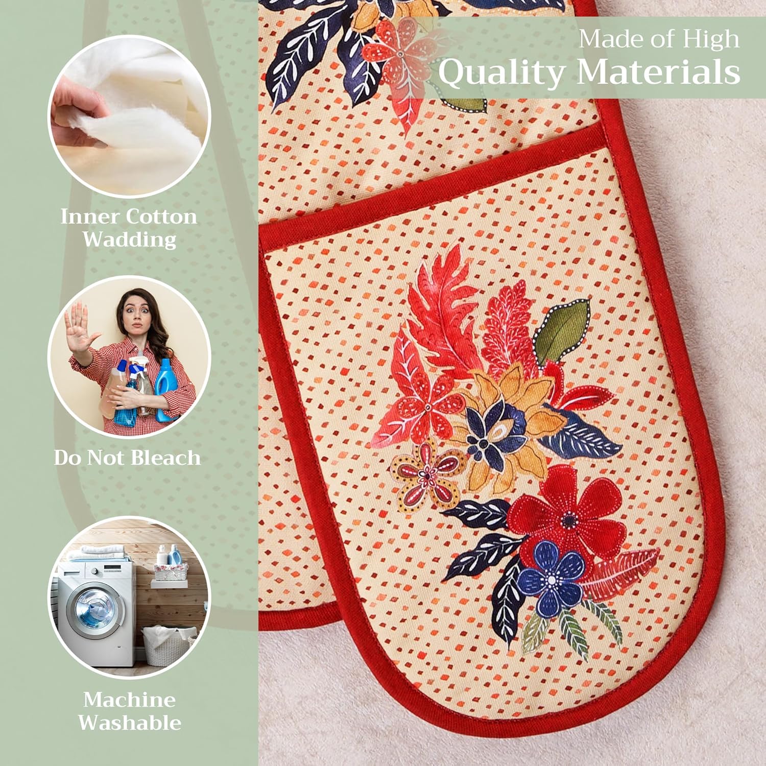 - Package includes: Includes 1 double oven mitt sized 7"x35". Perfect for handling hot cookware safely while adding a touch of European elegance to your kitchen. Designed in Europe and made in India with care