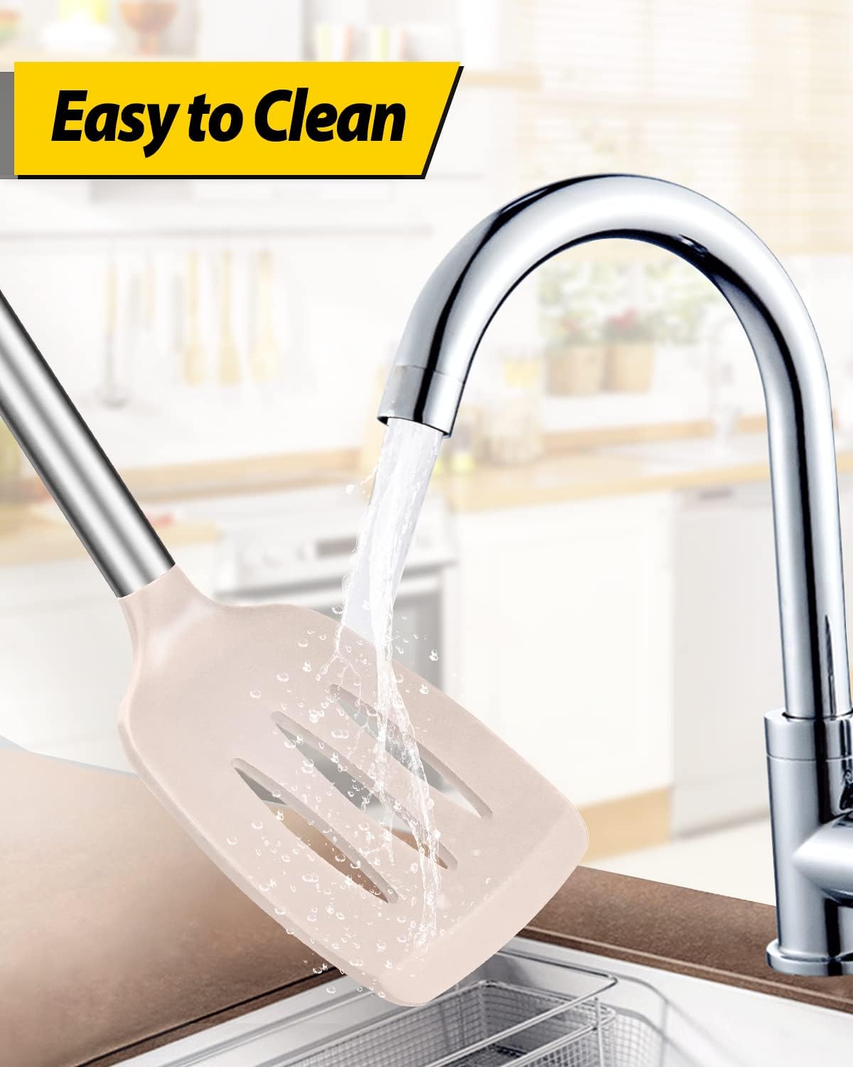Pack of 2 Silicone Solid Turner, Non Stick Slotted Kitchen Spatulas, High Heat Resistant BPA Free Cooking Utensils, Ideal Cookware for Fish, Eggs, Pancakes(Stainless Steel Khaki)