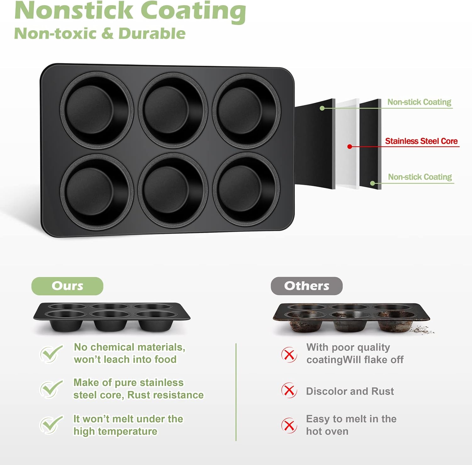 TeamFar Muffin Pan, 6 Cup Muffin Tin Cupcake Pan Tray with Nonstick Coating and Stainless Steel Core, for Home/Kitchen Baking, Healthy & Heatproof, Release Easily & Easy Clean, Set of 2