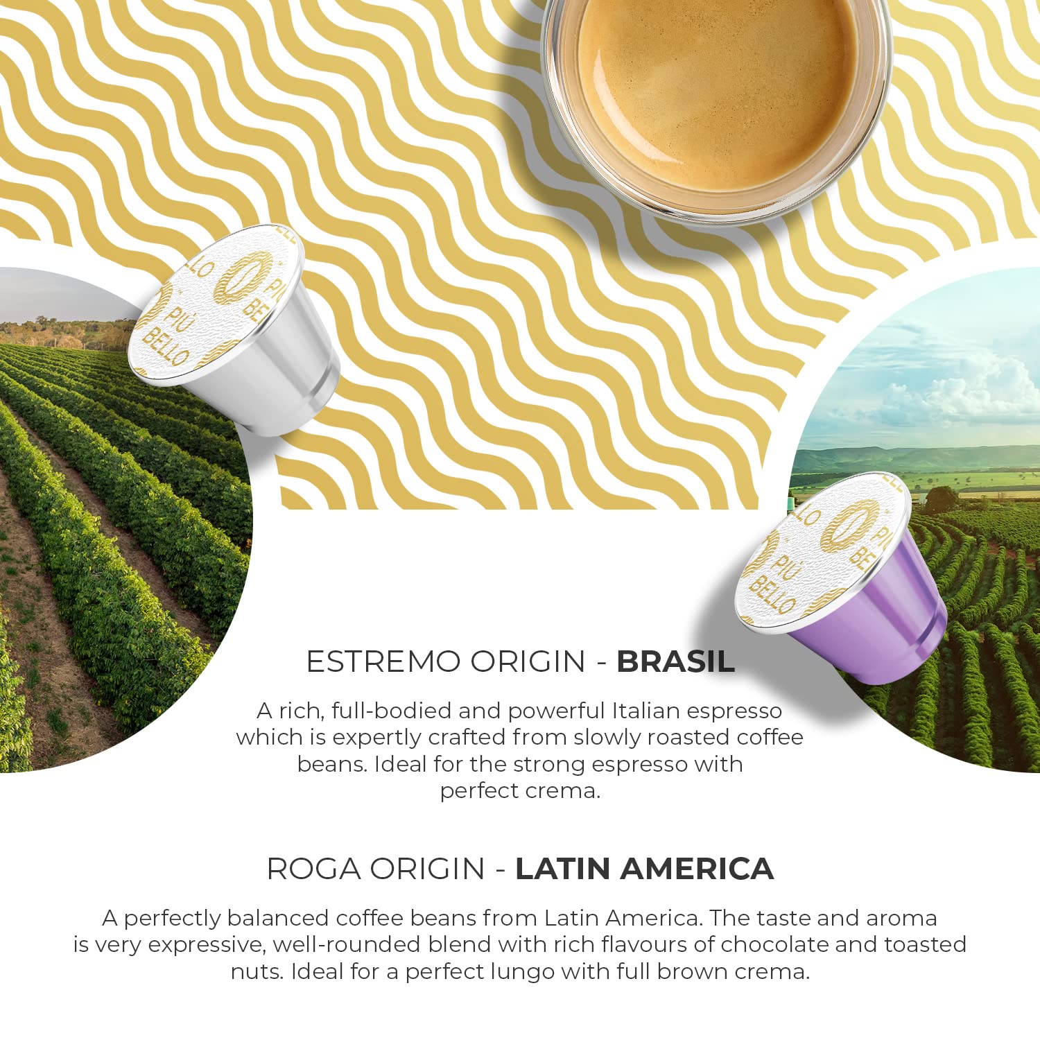 - NESPRESSO COMPATIBLE PODS - Enjoy delicious cafe quality roasted coffee, brewed fast and poured steaming hot & fresh directly into your awaiting cup. Piu Bello capsules are compatible with Nespresso Original line espresso machine.
