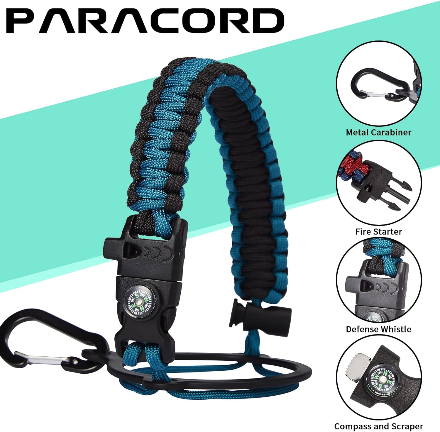 - UNIQUE DESIGNS PARACORD HANDLE: Full-function paracord handle made in individual styles to match the color of the flask water bottles. With compass, safety ring, carabiner, flint fire starter & whistle. It unravels into a sturdy and taut rope in an emergency, making the large water jug an ideal survival kit for expeditions in the wild