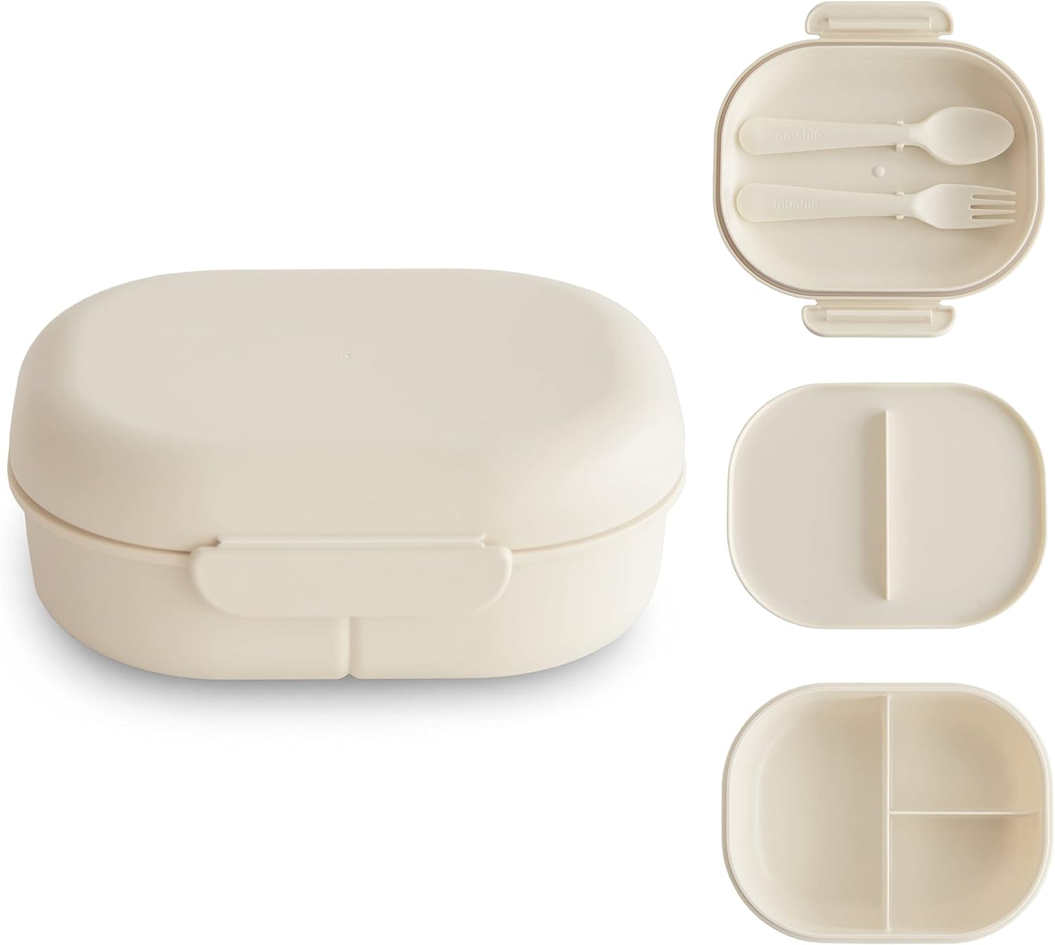 mushie Kids Bento Lunch Box | 3-Compartment & Removable Divider + Fork & Spoon Utensils | Great For Meals, School, Snacks On-the-Go | Dishwasher Safe (Ivory)
