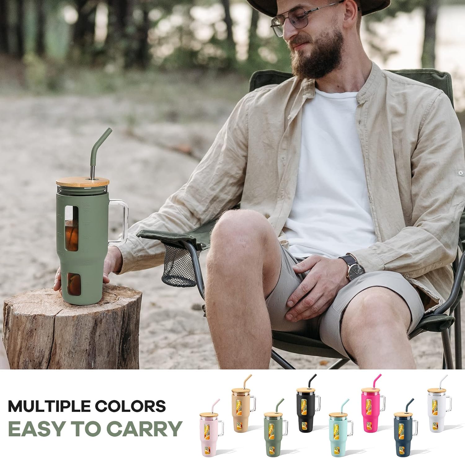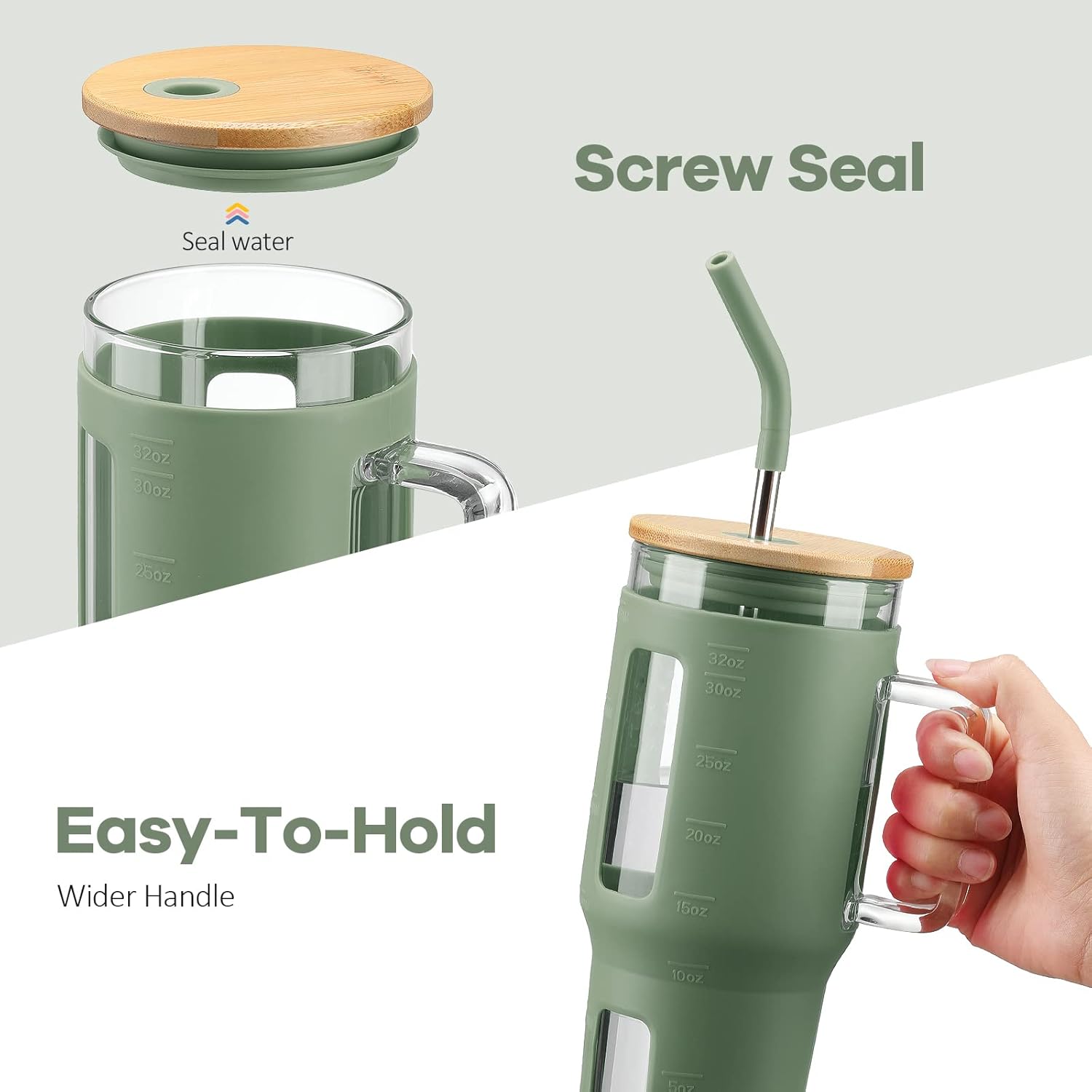 - GLASS TUMBLER WITH HANDLE - 32 oz glass tumbler with handle offers a convenient and practical way to carry and drink your favorite beverages. 32 oz capacity allows for a large volume of liquid to be held in the tumbler which avoid frequent refills.