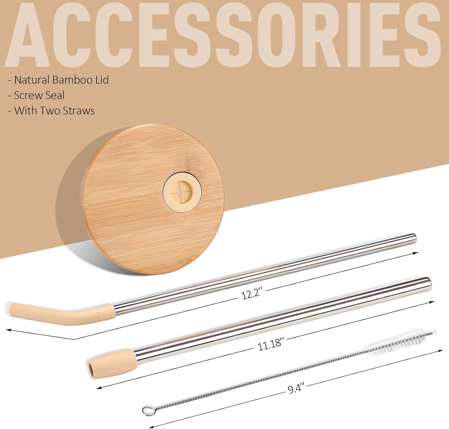 - TUMBLER WITH STRAW AND LID -Glass tumbler with bamboo lid and integrated stury handle. The 2 Straws -long drinking straw and boba straw offers effortless Sipping no matter what drinks. The lid has silicone sealing gasket for 100% leakproof. Ergonomic handle for one-handed drinking, helps in easy and balanced grip, perfect for travel or office work.