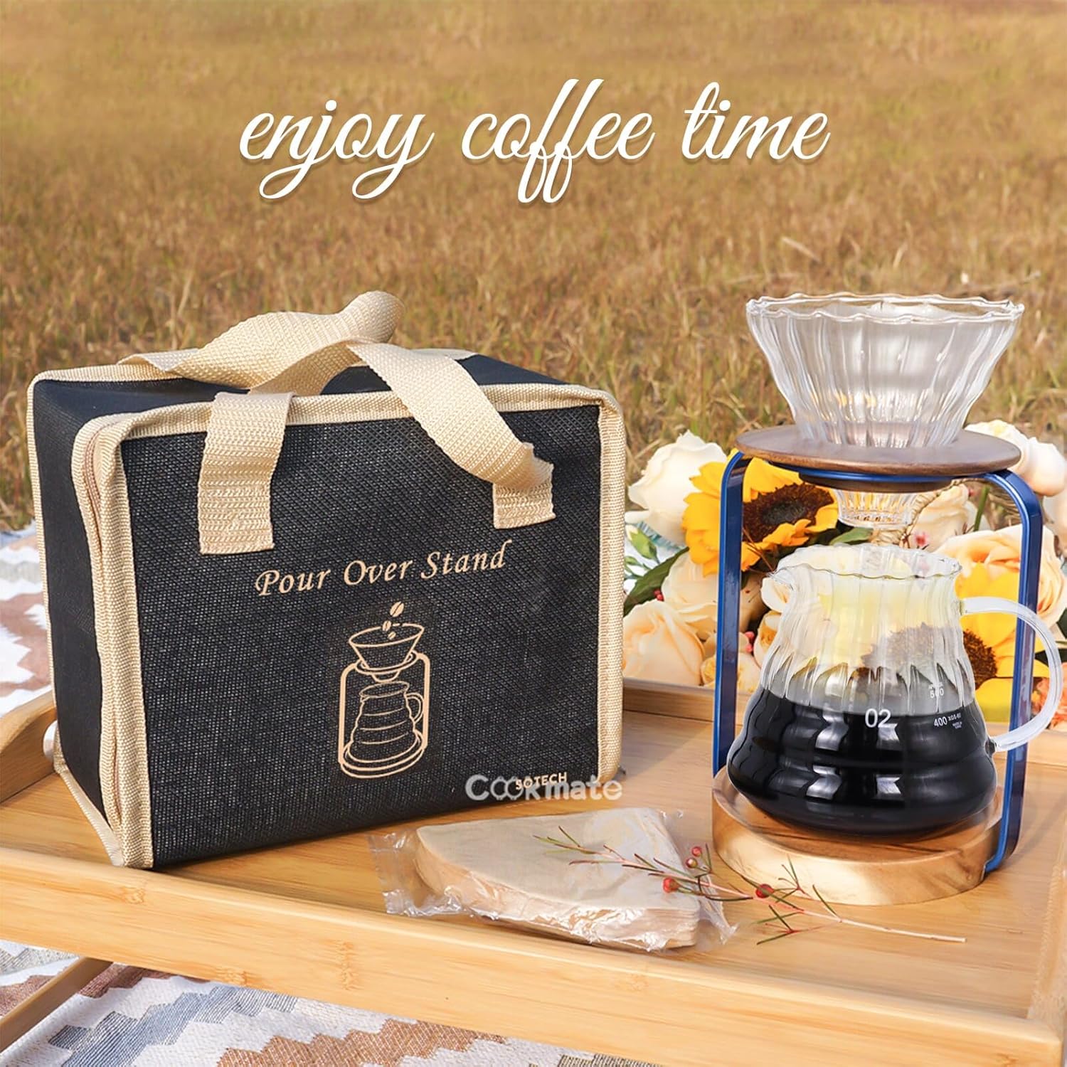 SOTECH Pour Over Coffee Dripper Stand with Metal Stand Wooden Filter Holder Glass Server with Paper Coffee Filters, Coffee Maker Stand Set for Coffee Tea and Saffron