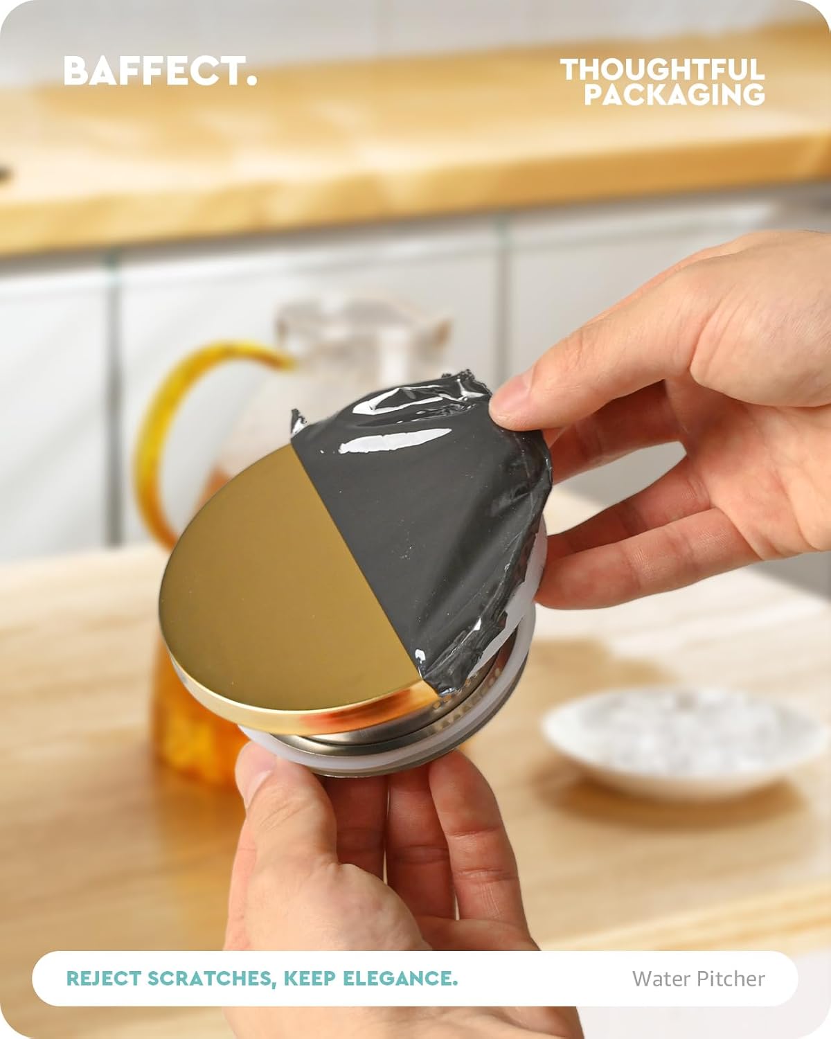 - Elegant appearance - Baffect Water Pitcher features an elegant look with hammered pattern. The golden stainless steel lid and glass handle of this leakproof glass water pitcher are electroplated for extra charm, making it suitable for gift giving.