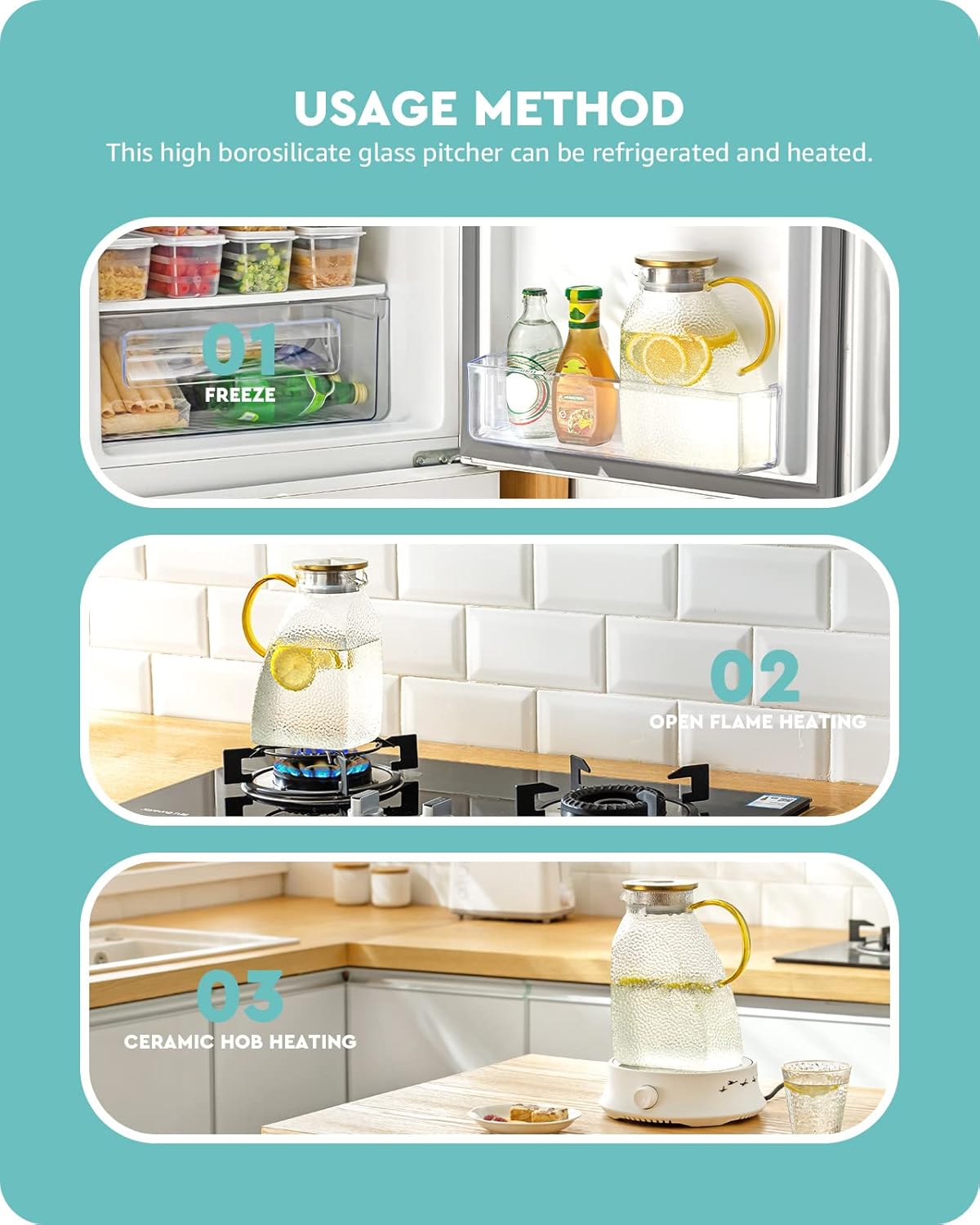 - Heat & cold resistant - This fridge door carafe performs well in terms of cold and heat resistance, capable of withstanding temperatures from -10 °C/14 °F to 110 °C/230 °F. This high borosilicate glass jug can be frozen in refrigerators and even heated in an electric pottery stove or over an open flame.