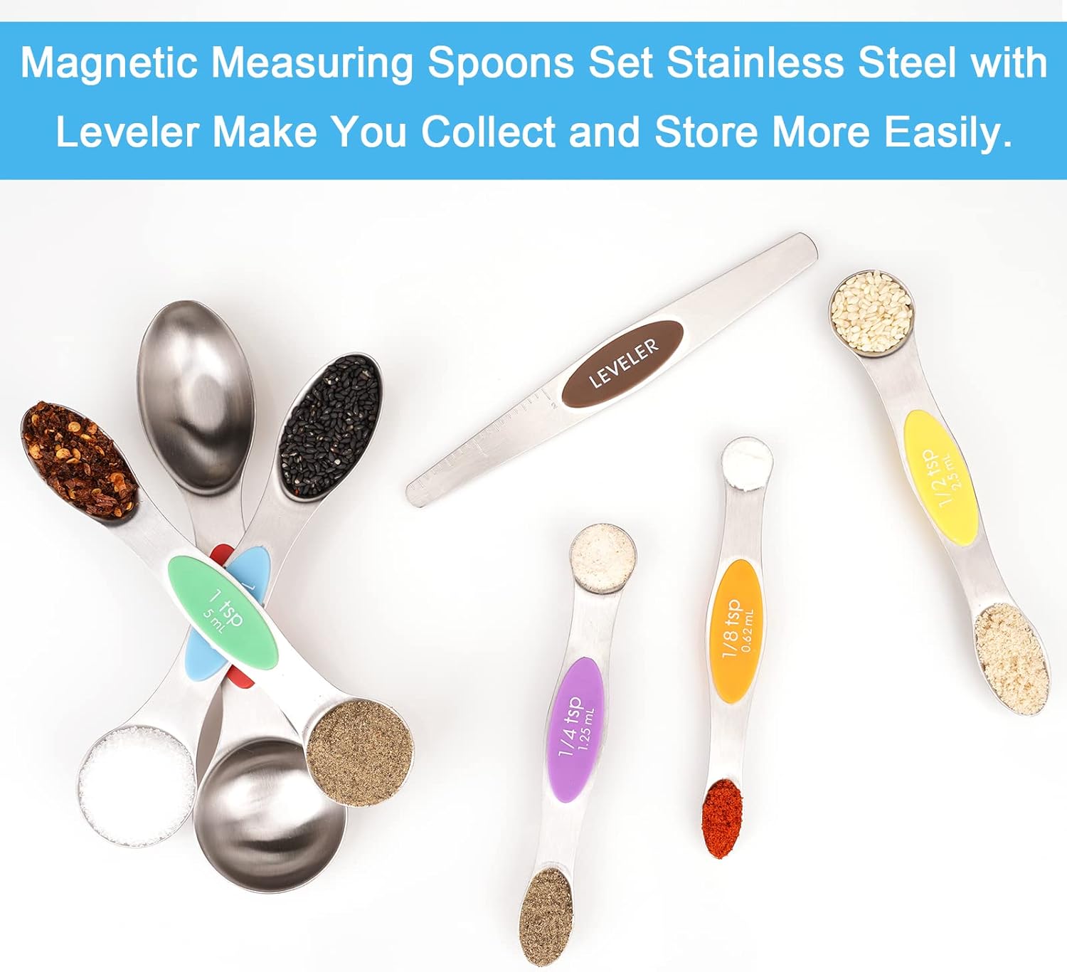 - 【Well-Designed 7-Piece Set】The Magnetic tablespoon set contains 6 metal measuring spoons: 1/8 tsp, 1/4 tsp, 1/2 tsp, 1 tsp, 1/ 2 tbsp, 1 tbsp, and 1 scraper. Dual sided: The oval end is narrow to fit into most spice jars. The round end is perfect for liquids. These stainless measuring spoons are great for measuring spice, sugar, salt, oil, coffee, wheat etc. Make your cooking and baking easier and more fun.