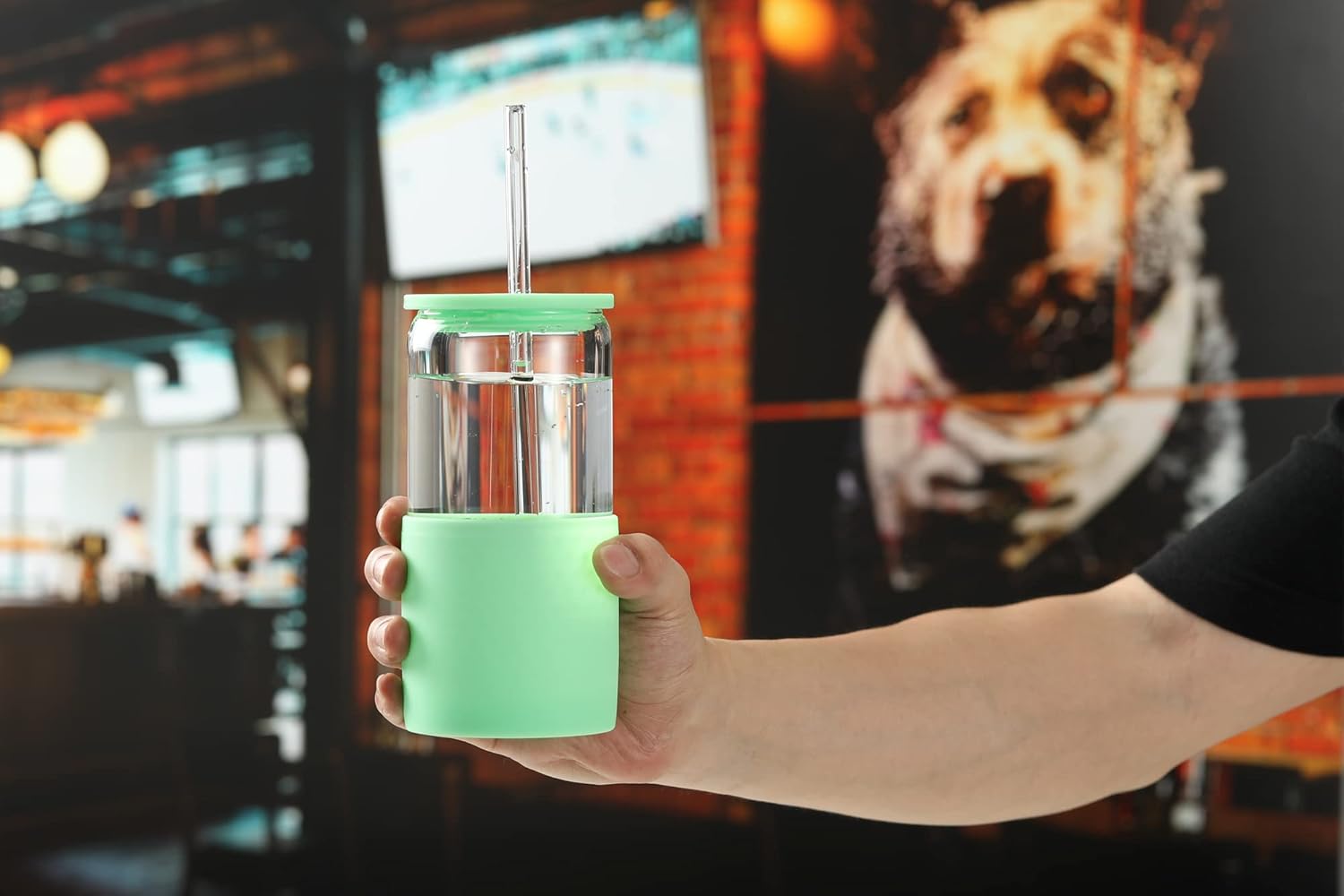 - The unique silicone sleeve and lid design provides a strong protection for the glass cup. if the glass cup is accidentally turned over on the desktop, the chance of breaking is very small, and the sealed lid ensures that the liquid will not overflow.