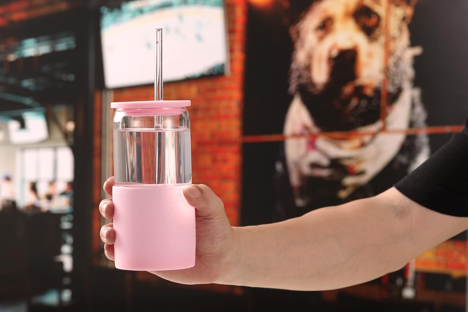 - Change the style of glass cups as you wish, you can match the colors of the cup lid and sleeve, such as a pink sleeve with a white lid. This reusable jar-shaped glass cup is perfect for iced coffee, iced tea, juices, sodas, milkshakes, jams, cocktails, beer, smoothies, bubble teas, and more.