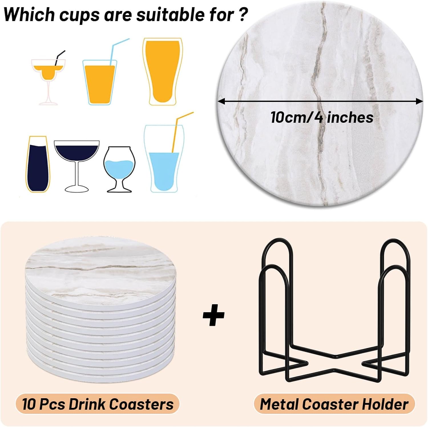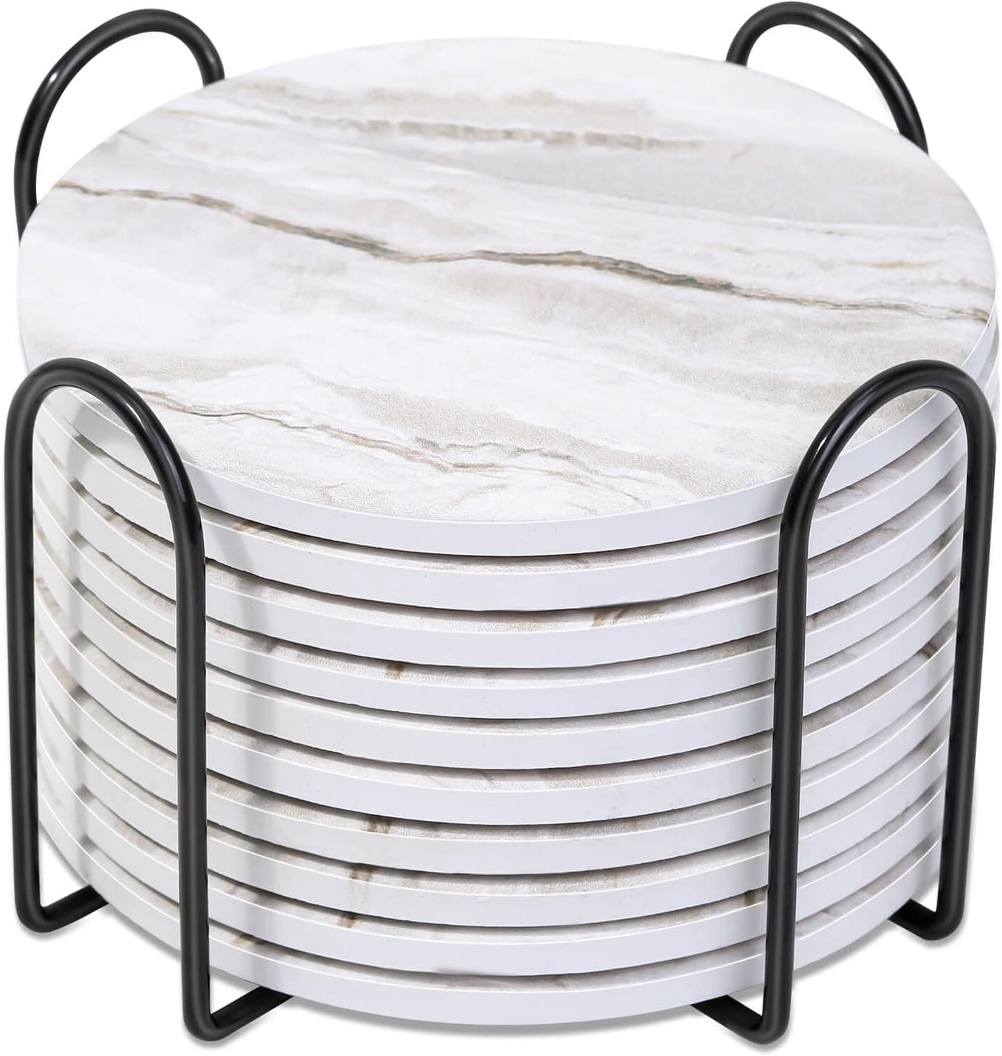 - Package including: Our drink coasters set includes 10 pieces of ceramic coasters and a metal holder. Gray marbling design is suitable for home decoration. The coaster holder makes the coasters convenient for storage.
