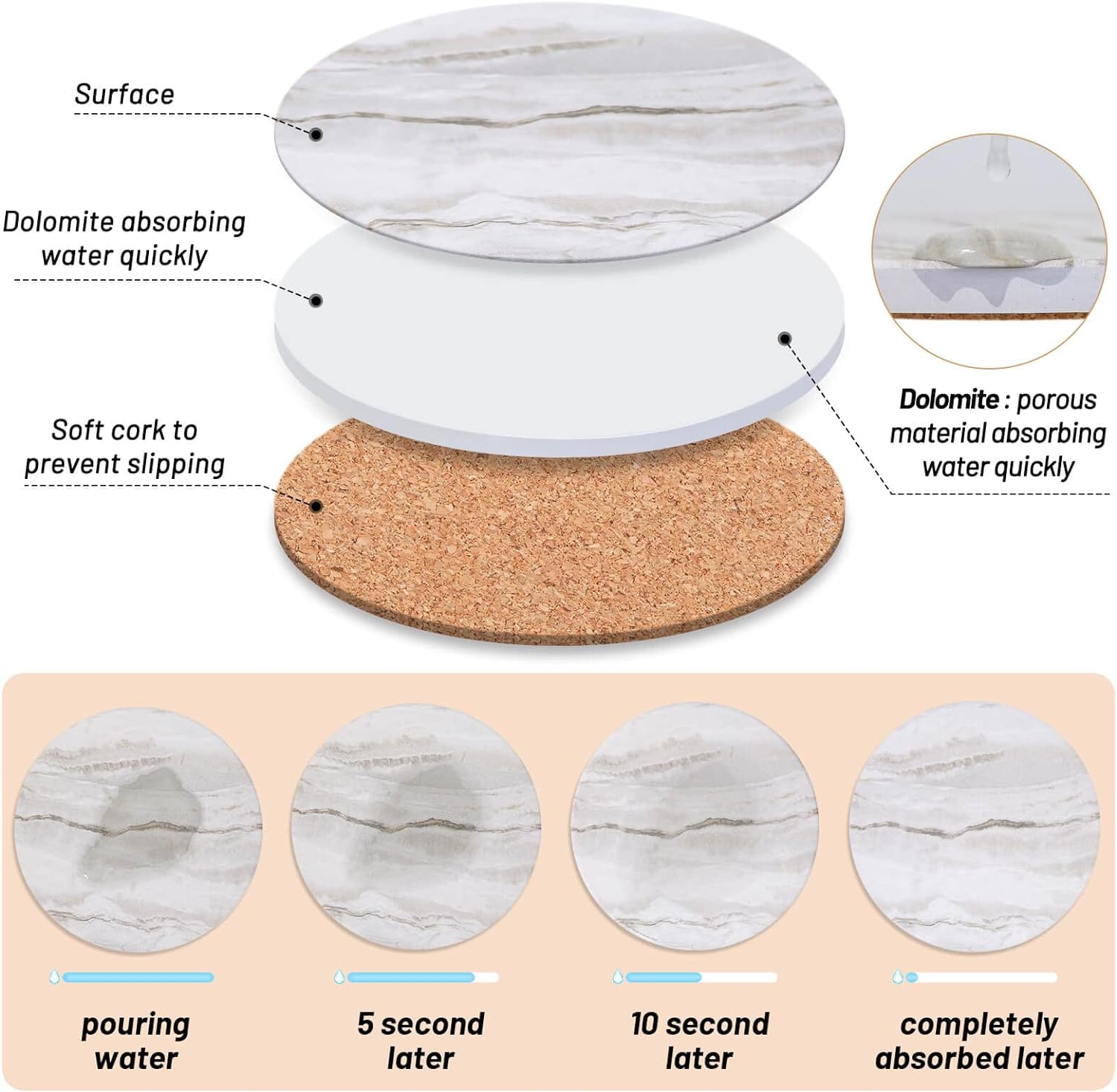 - Absorbent Coasters Set: These absorbent coasters for drinks are made of special absorbent ceramic, which can absorb water stains on the surface within 5-20 seconds to keep the table top or furniture clean and dry.