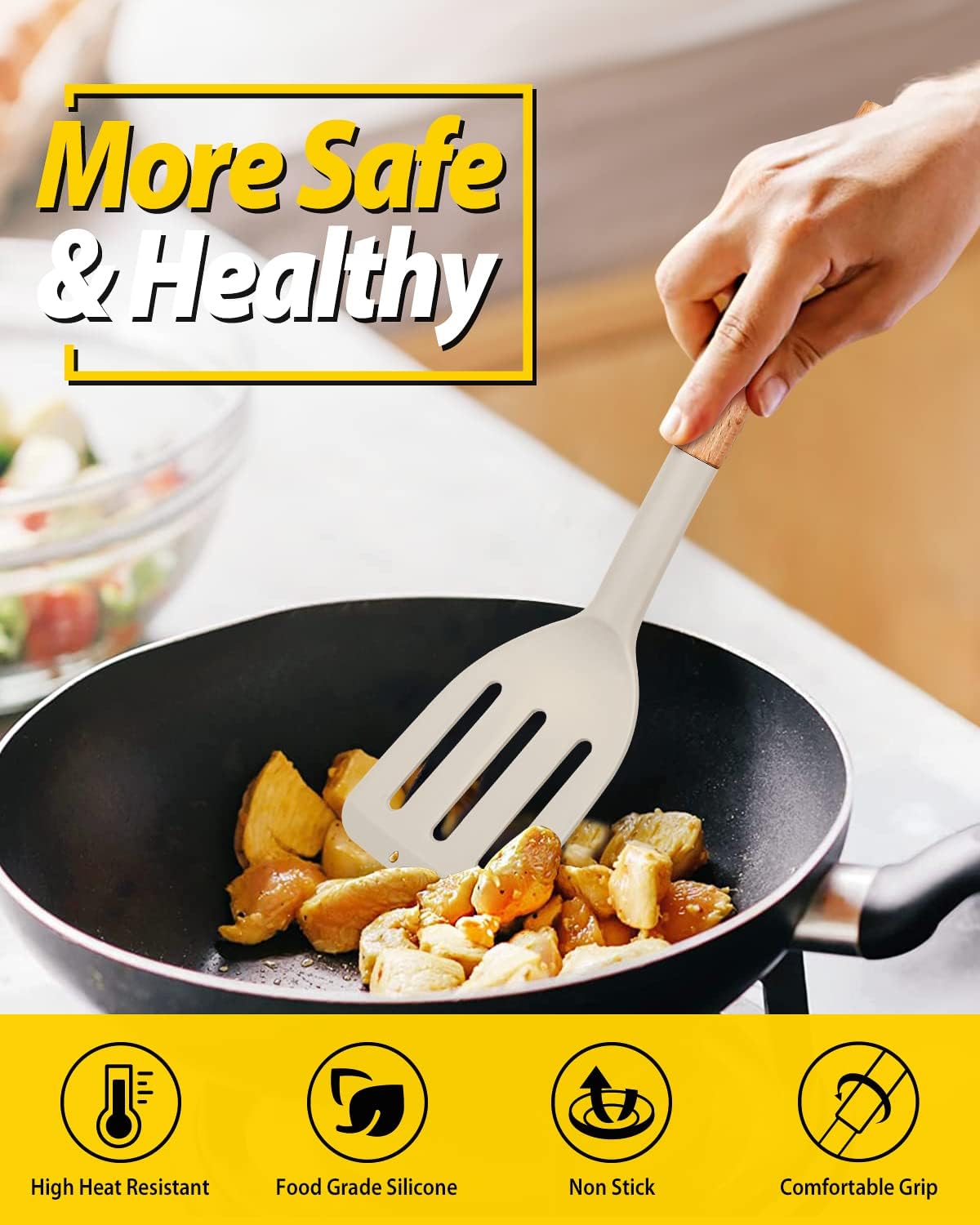 Pack of 2 Silicone Cooking Spatula, Heat Resistant Solid Turner, Non Stick Slotted Spatulas with Wooden Short Handle,Ideal Wood Kitchen Utensils Set for Frying, Baking, Flipping, Turning