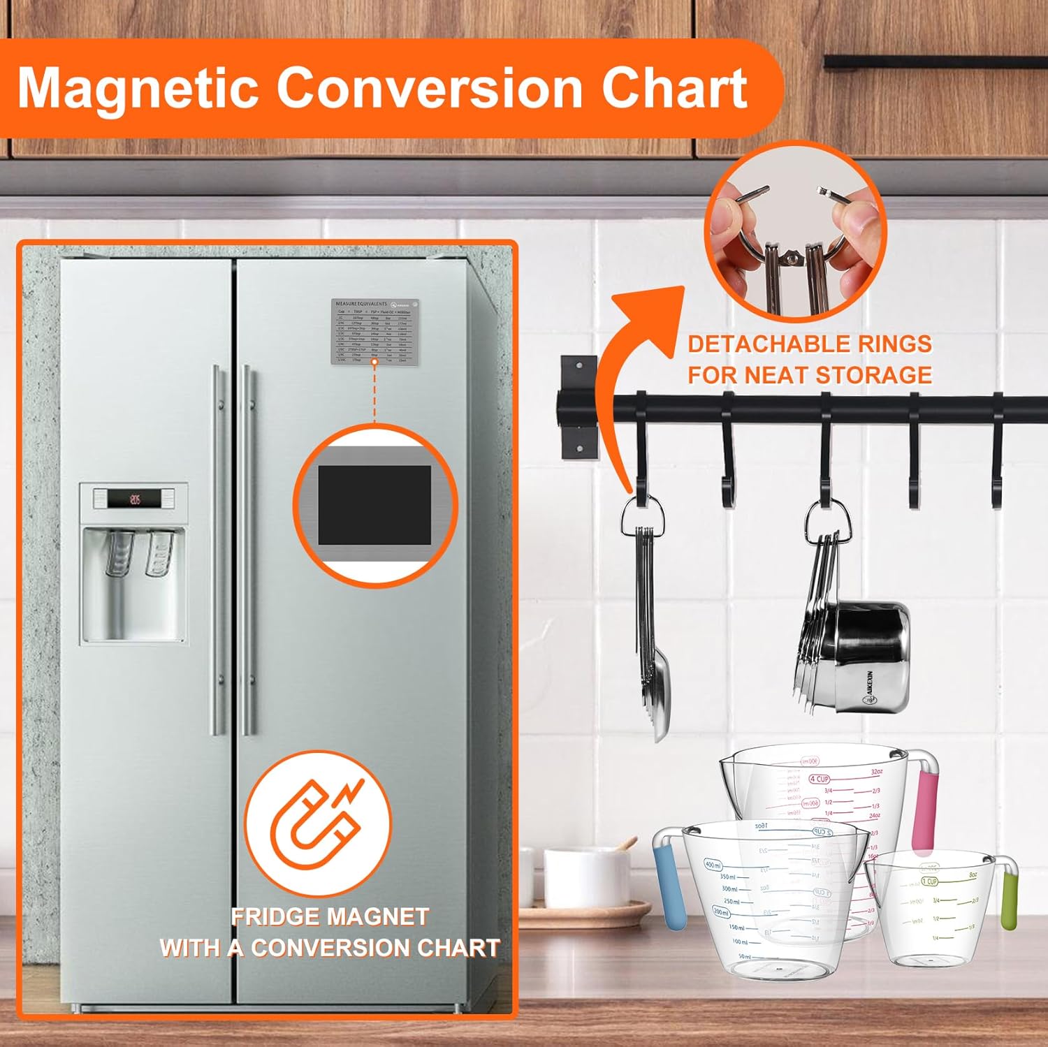 - [Easy to Clean and Store]: Stackable professional measuring cups and spoons set is easy to clean, which can be safely put into the dishwasher after use. Metal rings allow them to be stored in drawers or hung on hooks in the kitchen, which not only save space but also perfectly keep the kitchen clean. (but for the plastic cups, manual cleaning is recommended).
