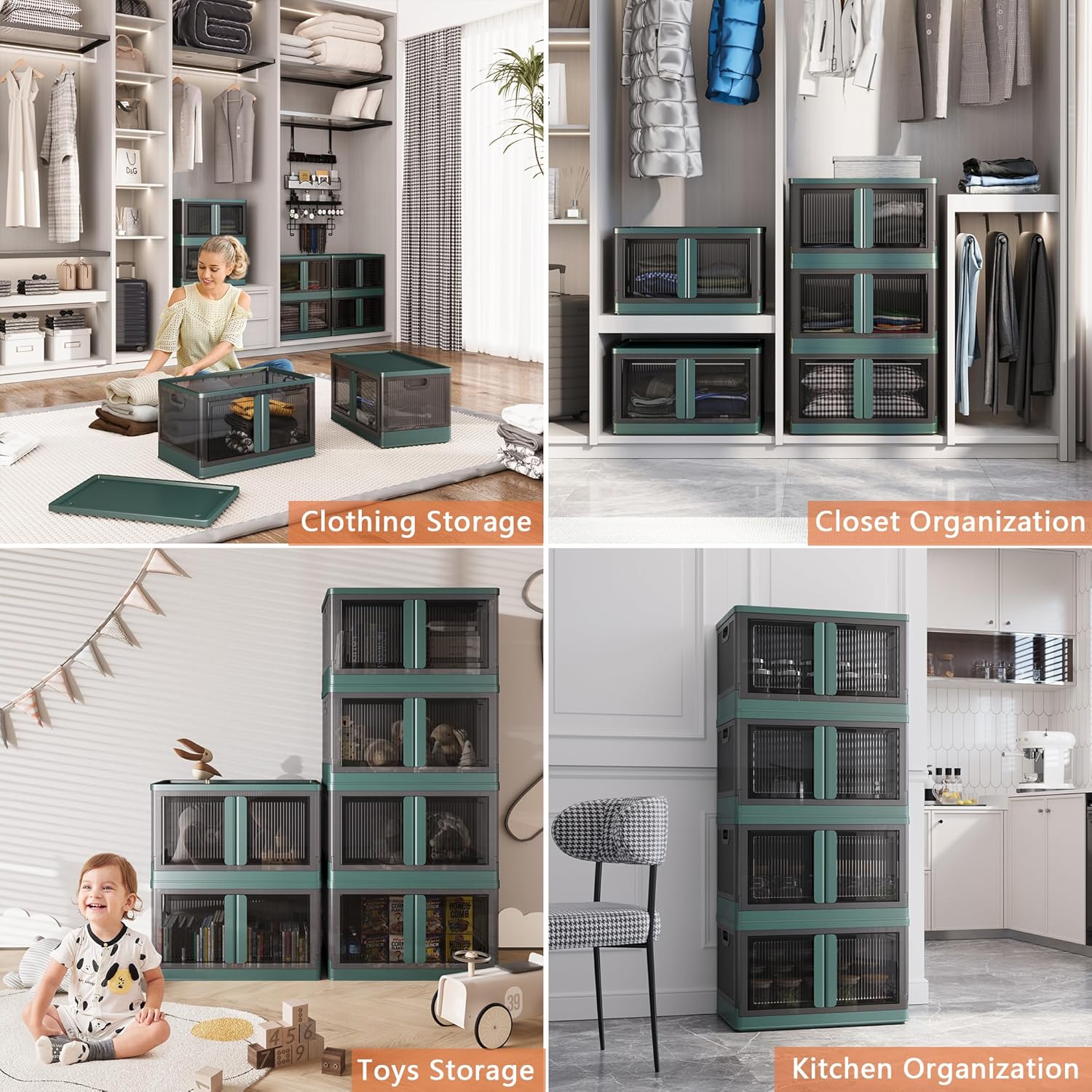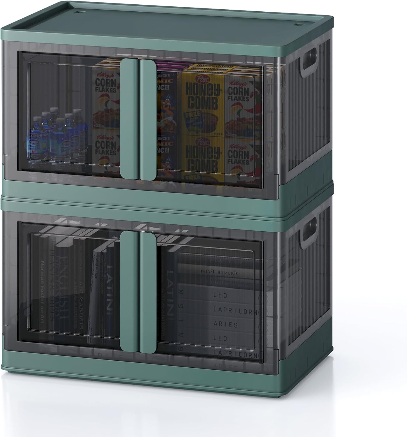 19Gal Collapsible Storage Bins with Lids & Wheels - 2 Pack Stackable with Doors, Heavy-Duty Plastic Containers for Home/Office, Green