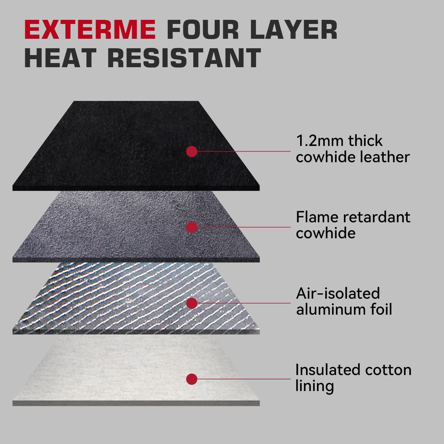 - Excellent 4-layer Heat Resistant: The welding gloves are constructed with 100% heavy-duty flame-resistant split cowhide, featuring double-reinforced layer padding, high-temperature-resistant aluminum foil, and a soft insulated cotton lining. They can withstand super high temperatures up to 932℉, providing protection against extreme heat, ultraviolet, and infrared radiation during welding.