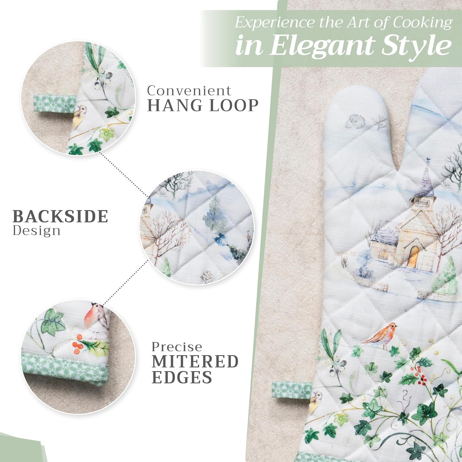 - Artistic style: Add charm to your kitchen with our oven mitt pot holder set featuring watercolor designs inspired by traditional European motifs. Stylish and functional kitchen accessories for every home cook or gift occasion.