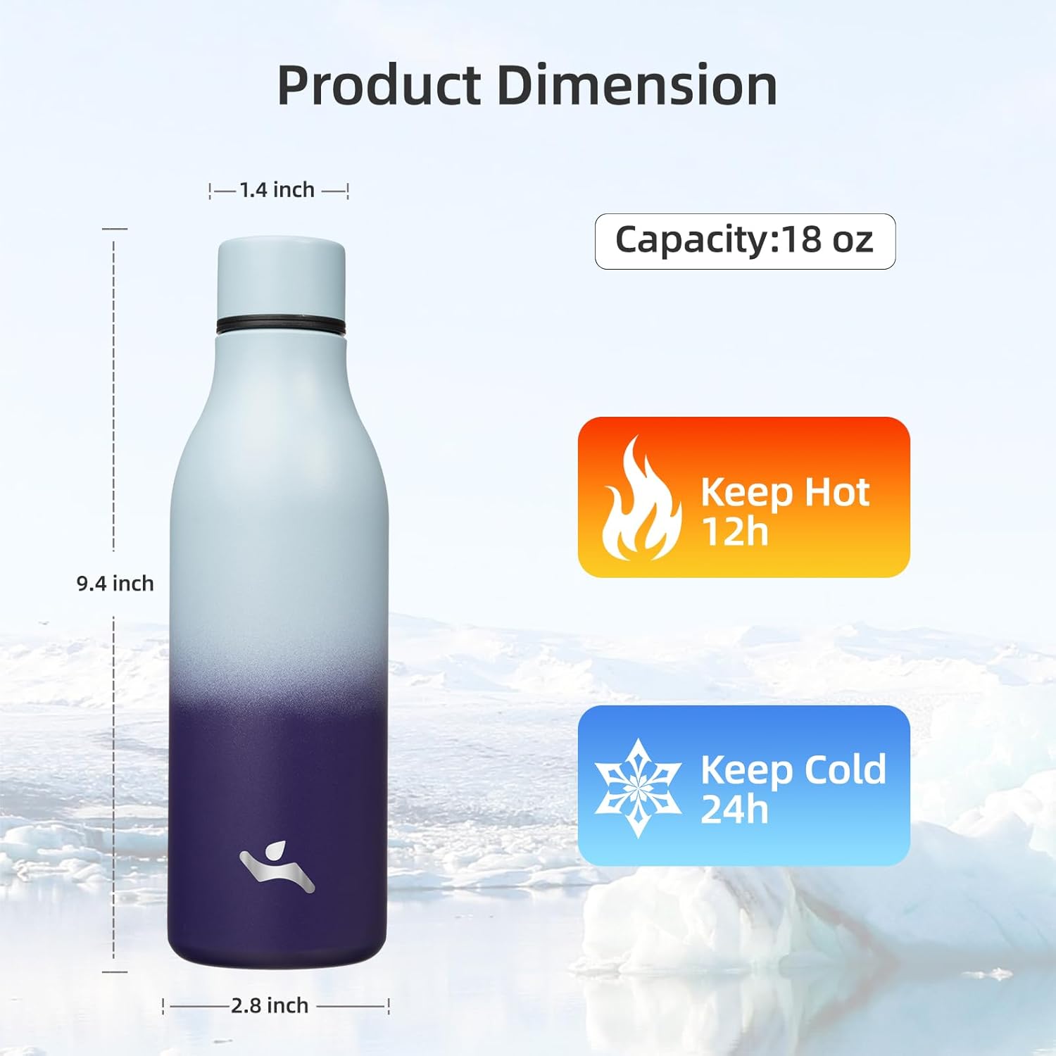 - The 18 oz water bottle comes in a variety of colors to choose from, including solid colors, ombre colors and shining colors. Choose the color you like best. Stay refreshed and energized with Konokyo insulate water bottle