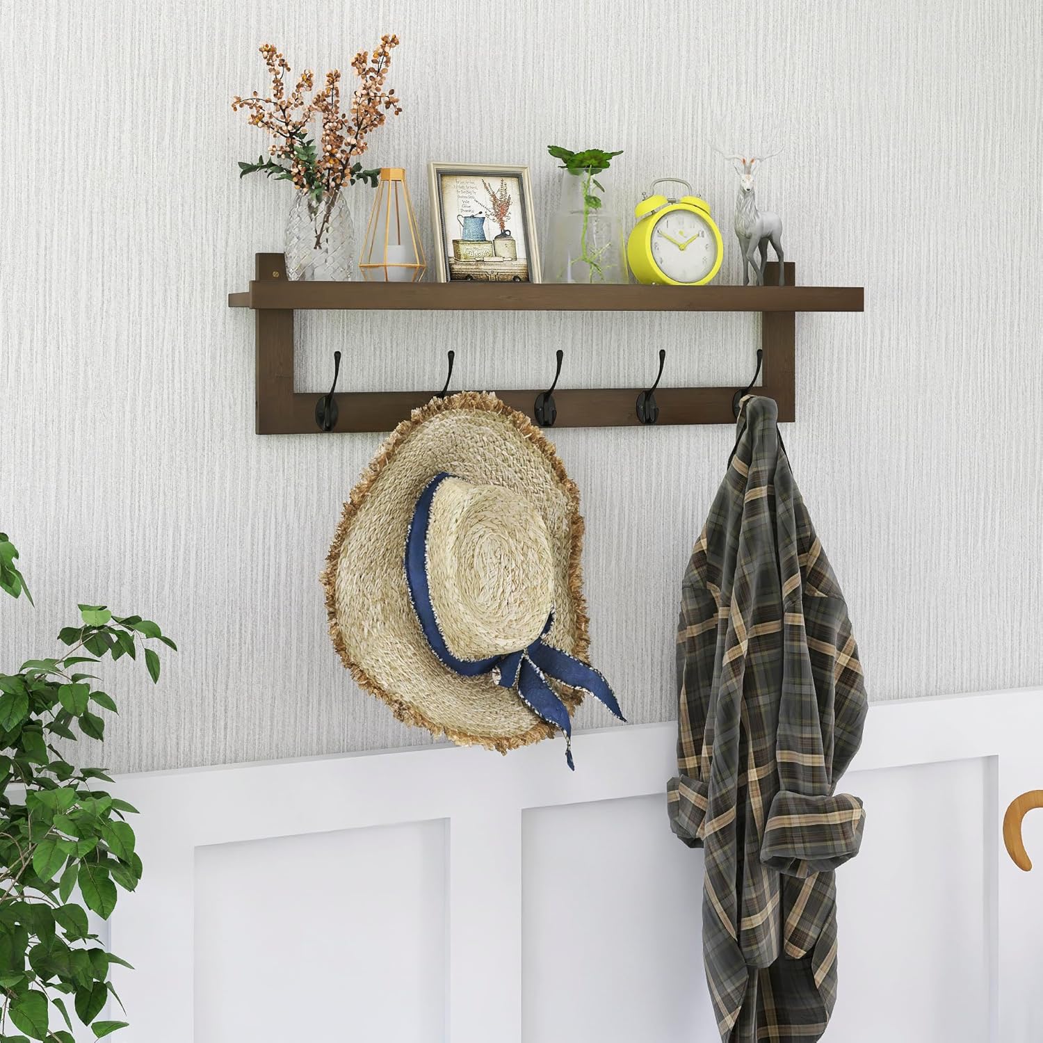 - ★ ORGANIZE AND DECORATE TOGETHER:this beautiful hanger is thoughtfully designed with baffle to safely hold your key, wallet, plant, candle, and can be used as a display rack for picture frame, envelope, decorative letter. 5 double metal hooks to hang hat, coat, jacket or bag, so all your essentials are neatly organized in one place and at your fingertips
