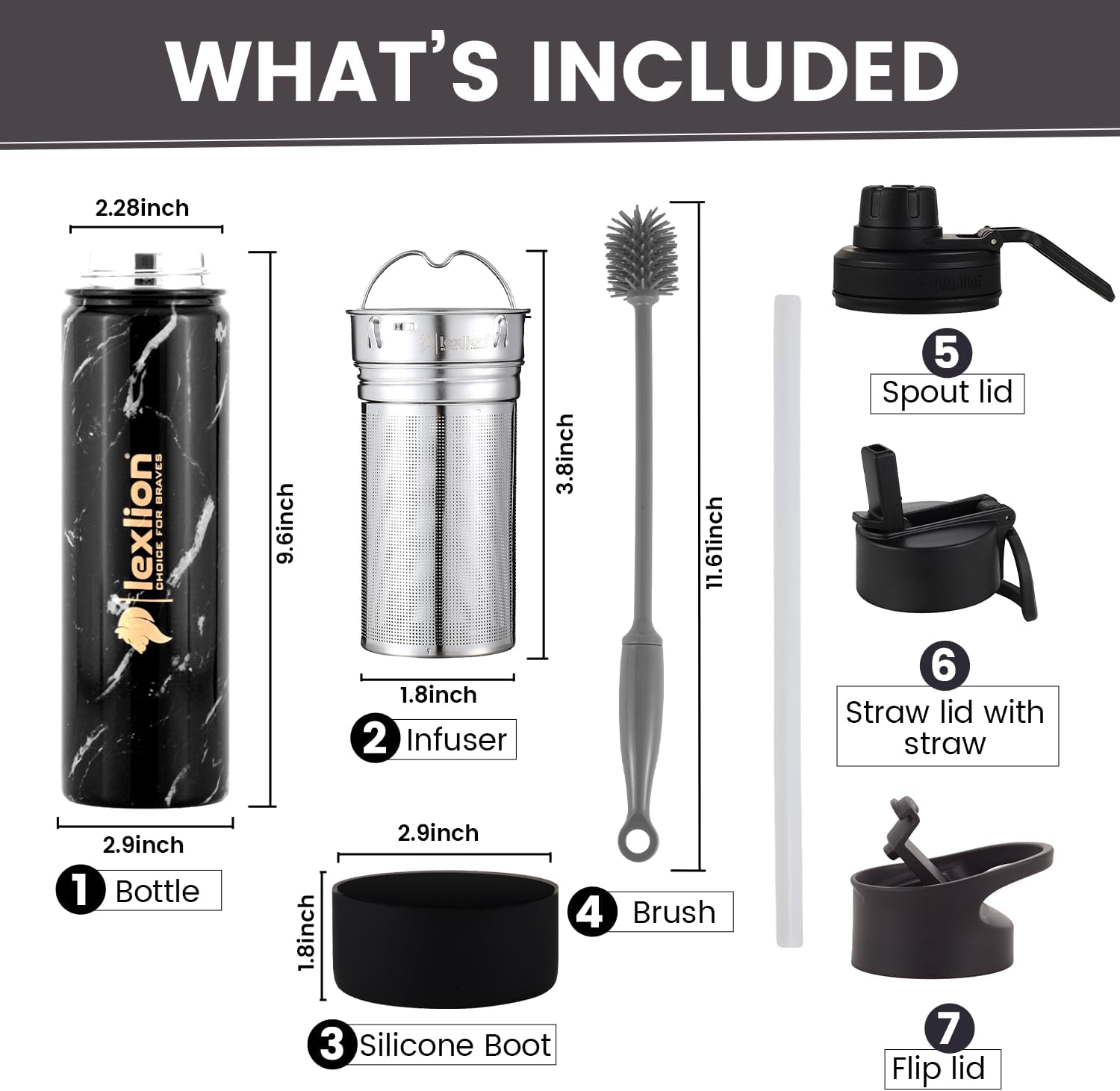 - ✅ LIDS & INFUSER/STRAINER- Lexlion water bottle 22 oz comes W/3 LIDS! a spout lid, a flip lid & and a third lid which is stainless steel lid, 100% leak-proof & dishwasher safe. It includes a newly designed 2-piece strainer stainless steel, a very convenient filter to make loose tea leaves, cold coffee brews, herbs, or fruit-infused water. Add them to the filter basket, close it & clip in the tea water bottle infuser with water. If an infuser is not needed, just remove it.