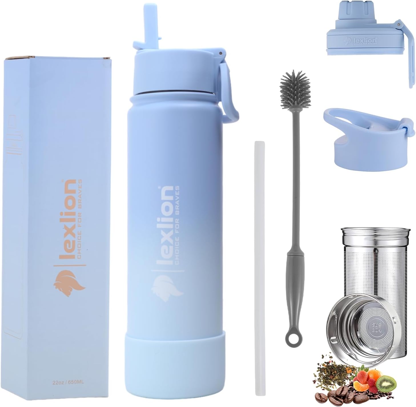 Lexlion Tea Infuser Water Bottle 22 Oz, Triple Walled Insulated Stainless Steel Bottle, Thermal Fruit Leaf Infuser, Silicone Sleeve, 3 Lids Leakproof, Metal Mug Gallon