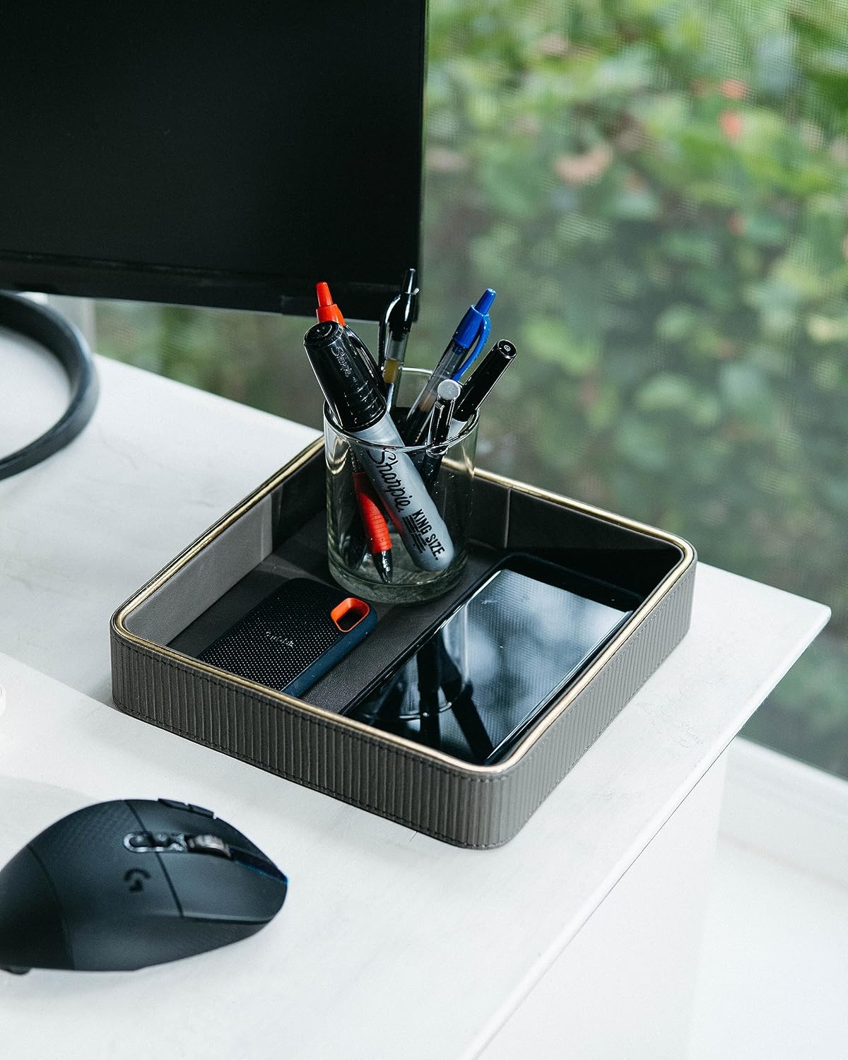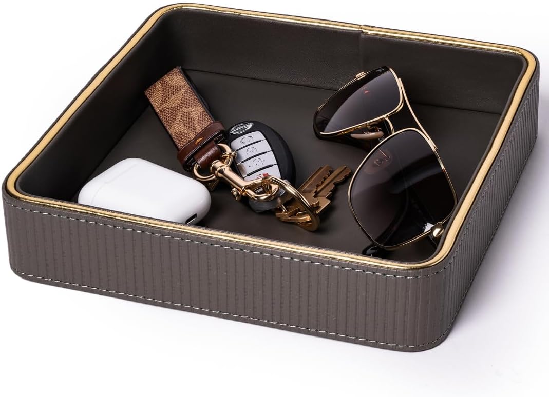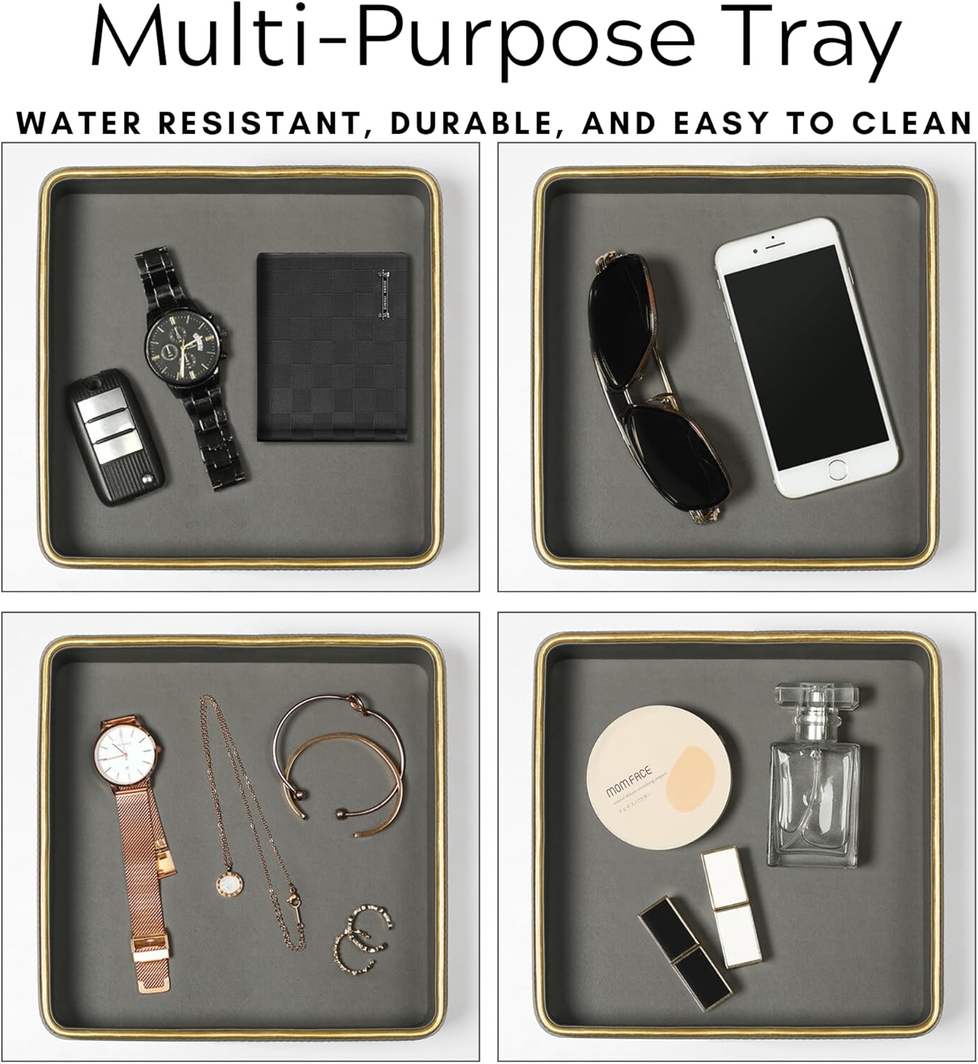 - 🎁 Creating Order with Elegance: Our versatile and water resistant gray phone tray key and wallet tray for men and women is tailor-made for your bedside table decor, tray organizer for dresser decor, dresser trays for bedroom or even a remote tray, or catch all trays. This valet tray organizer adds a luxurious decorative touch while keeping everything beautifully in place. Or buy 2 pack as nightstand organizers and put them on each side of your nightstand.