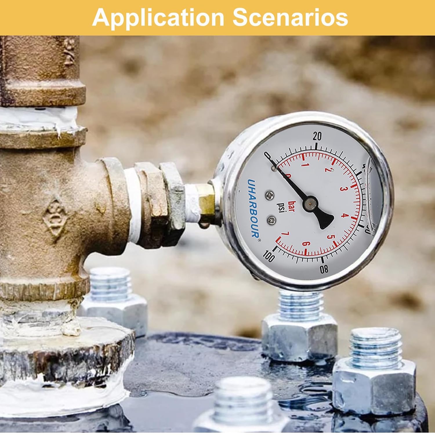 - GELYCERIN FILLING PRESSURE GAUGE 1/4 NPT WITH 2-1/2" CLEAR DIAL enhance the reliability and integrity; helps dampen the effect of vibration and pulsation; Clear dial with dual two colors scales(bar/psi) make the pressure gauge 1/4 NPT easy to read;