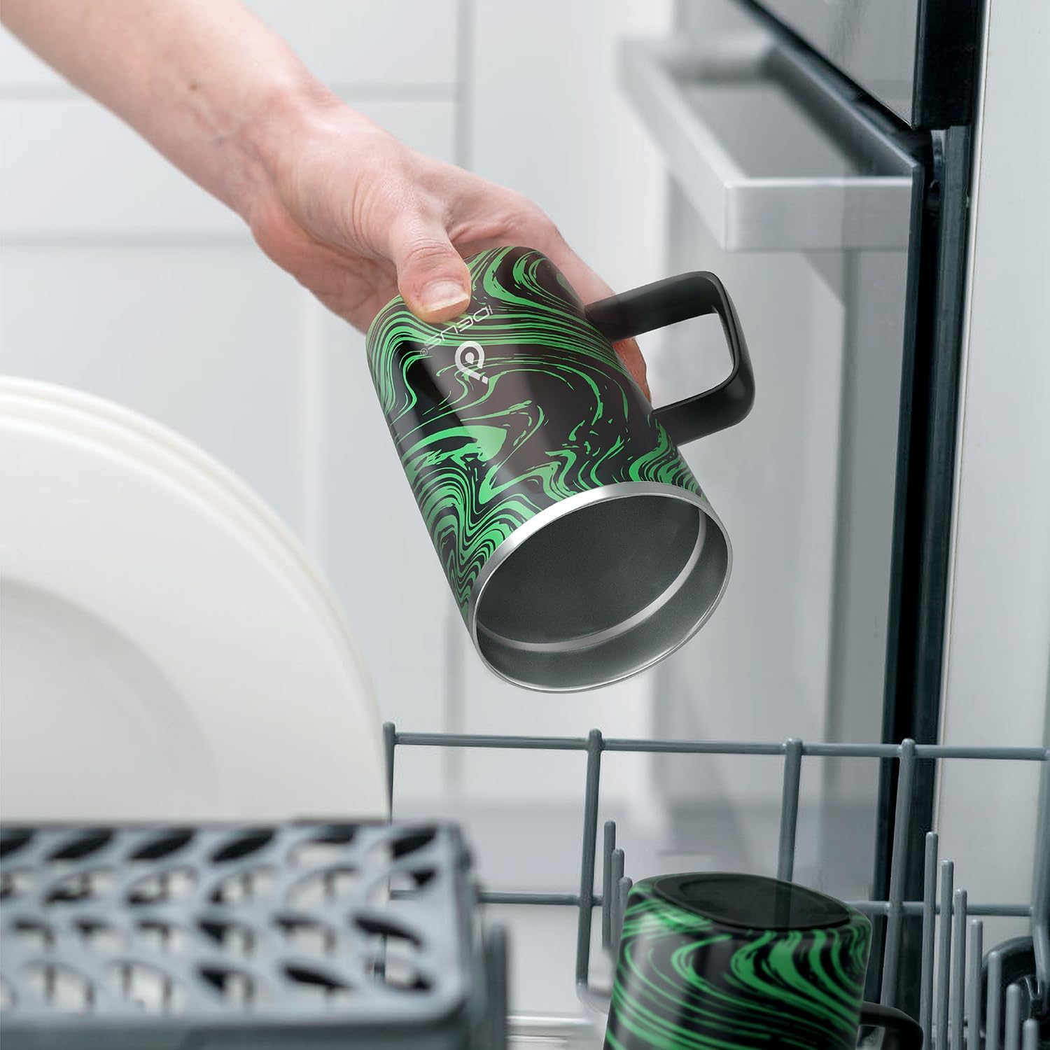 Ideus Vacuum Insulated Coffee Mug, 16oz Reusable Stainless Steel Thermal Double Walled cup with Handle and Slider Lid for Hot & Cold Beverages, BPA Free (Green Zebra)