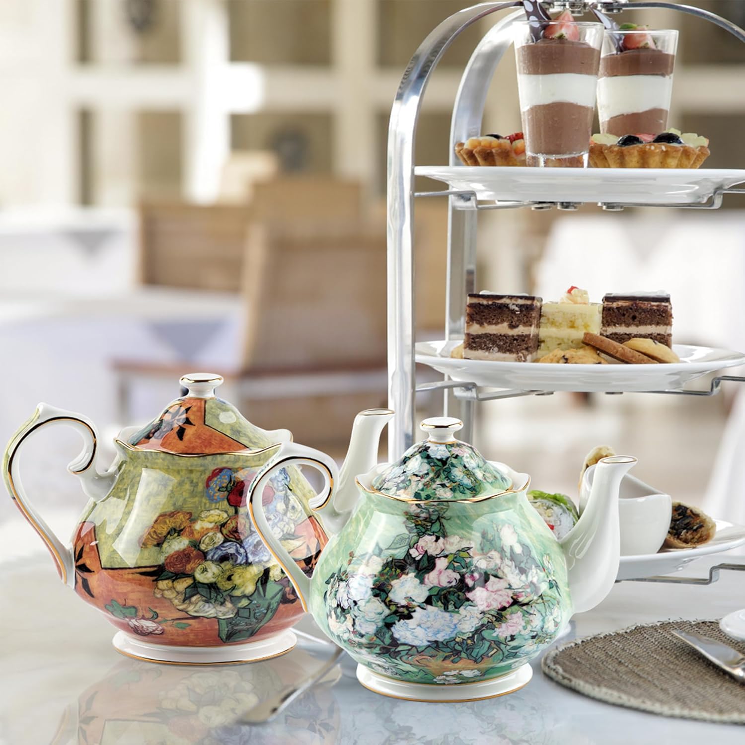 Teapot 30 oz Van Gogh Paintings Bone China Loose Tea Pot Floral Design Vintage Ceramic Coffee Water Pot European Style Porcelain (Flower Vase)
