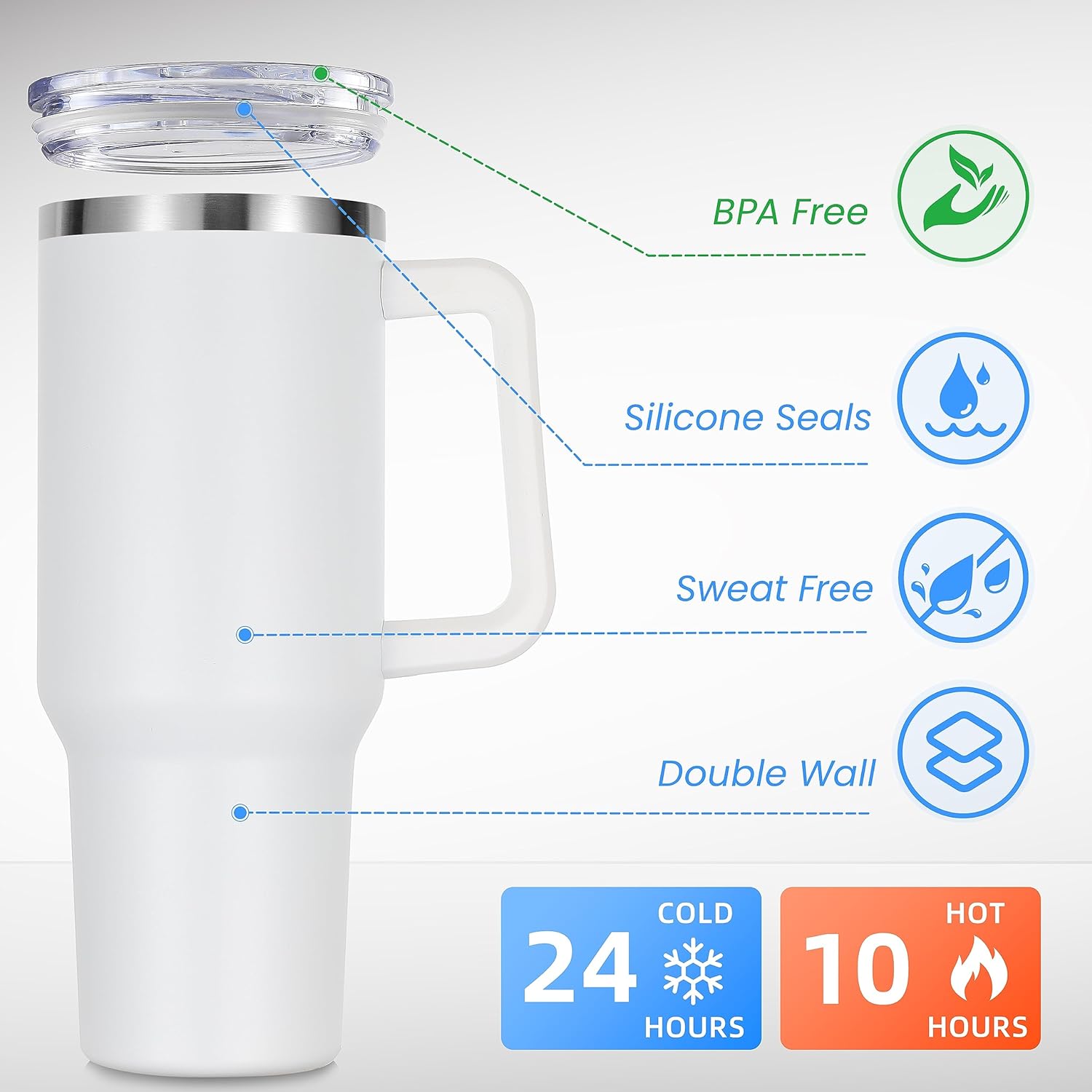 - 40oz Tumbler: This insulated 40oz tumbler with straw and handle is made of high quality 18/8 food-grade stainless steel, this cup is odorless and reusable, effectively reducing pollution.