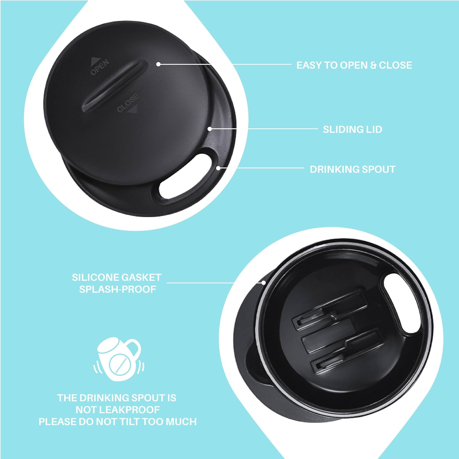 - 【PRESS-IN LID】- Silica gasket seals to achieve maximum spillproof capability. Drinking hole on the top, with a splash-proof sliding cover. Please note it is to keep drinks contained and prevent heat/cold from escaping. It is not leakproof.