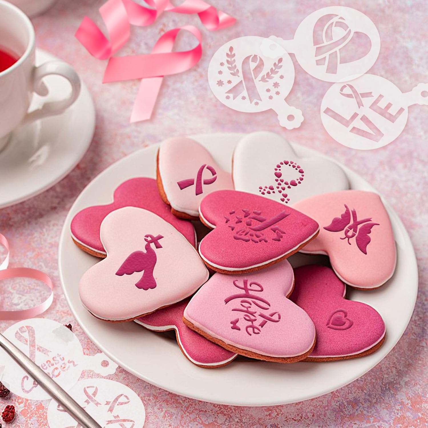 - 【Size and Material】The breast cancer awareness cookie stencils are 2.76 inches in diameter. The cake stencils are made of food-grade security PET, which is strong and durable. Stencils templates are laser-cut, have no sharp edges and are safe for you to use. These breast cancer awareness cookie stencils are suitable for food preparation. Wash the stencils templates with soap and water after each use for easy storage and next use