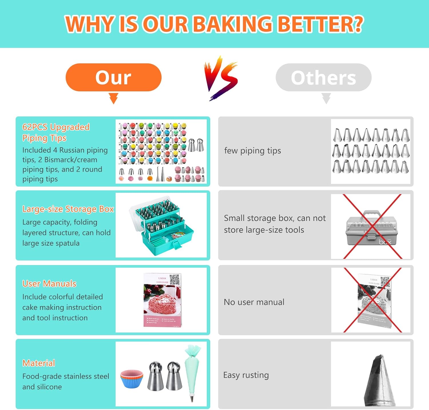 - 358 Pcs Cake Decorating Kit: Everything you need to start baking and decorating cakes in one beautiful cake kit! Collapsible mint green decorating kit holds all of your baking accessories, keeping your supplies organized and easy to move. This cake decorating tool set adds 50 happy birthday cake toppers to make cake decorating easier and more fun!