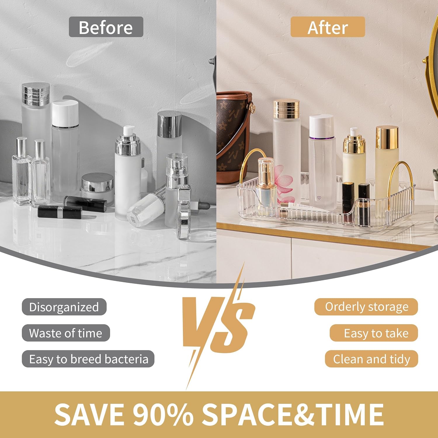 - 【Multi-Color Optional】Bathroom Organizers and Storage made with Gold rod and dark green, amber gold, and transparent white tray, the overall light luxury retro. The new silver rod with smoky gray, low-key luxury with texture. A variety of colors to choose from, not only helps you complete the task of storage but also allows you to easily achieve the room decoration