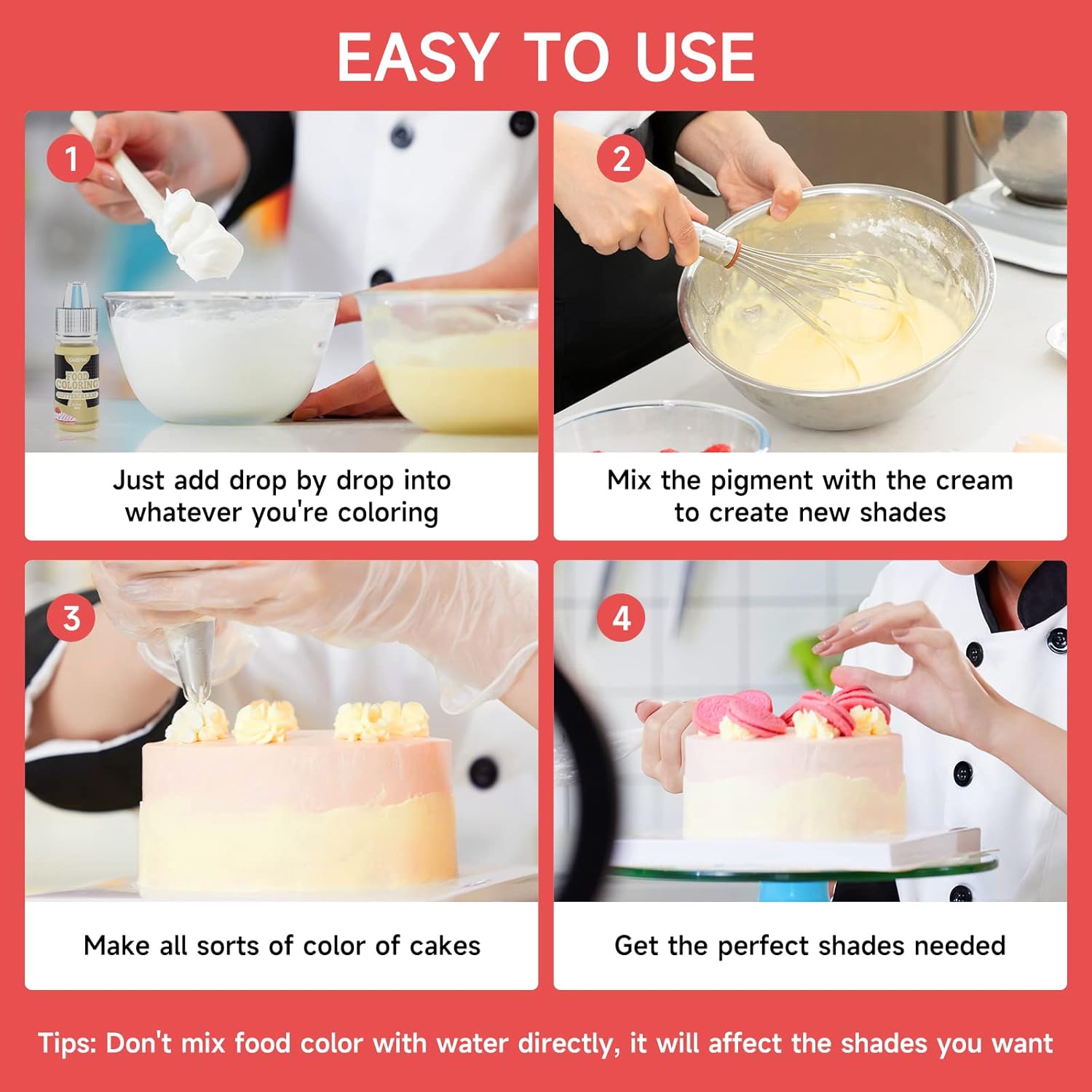 - Easy to Use: Our food coloring liquids come in an easy-to-use bottle with a precision dropper that allows you to control the amount of color you add. No more messy measuring cups or spills.